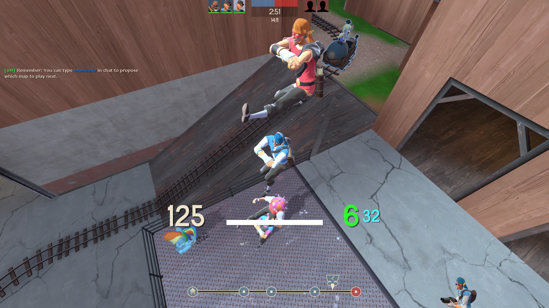 >>42580611August 2023Added additional clipping where neededFixed some windows clip and trip spotsAdjusted Red respawn base times to not go over 10 (could get to 11 and 12)Capture point HUD layout now matches its map kin (Gravelpit and Sulfur)Updated map menu images to the present day (1970)Reduced one-way door speed to stop ejecting players into orbitRebuilt B Red spawn exit to a cleaner style to alleviate spawn trapping and potential campingFixing some props that fade too earlyMoved medium healthpack to the side between D->E to avoid accidental pickupsReduced speed of handrail deployment so it doesn't overtake the bridges in the rare case that Blu captures C and D in quick succession