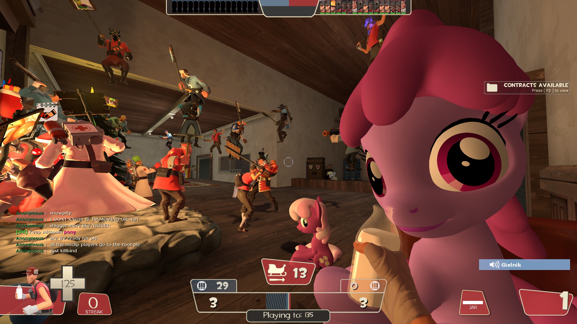 "Your mother!" editionThread theme: https://www.youtube.com/watch?v=dMQpfUBQi9wOLD THREAD: >>42500334Pony maps, sprays, and micspam!Reskinned vanilla maps (with mares) by our very own anons!Come relive the heyday of pony TF2 with your friends from /mlp/!Visit our official website to check out the server info from your browser: https://mlp.tf/>Server infoServer IP: tf2.15.ai OR 74.91.123.131:27015Password: check filenameSteam group: https://steamcommunity.com/groups/mlptf2_The steam group chat is active, come and say hello!Map downloads (extract the .bz2 file, then place the .bsp file in /tf/download/maps): http://mlp.site.nfoservers.com/server/maps/Download demos from matches (request demos in the thread): http://mlp.site.nfoservers.com/server/demos/Active hours: 7-9pm to 12-4am EDT (32-64 players)Custom MvM also available for early hours (42 player limit) and other gamemodes like Death Run or VSH for after-hours.This server uses a plugin that changes the stats of some weapons. See https://forums.alliedmods.net/showthread.php?p=2717299 for more info. All reverts except for the old airblast are active by default, and most reverts can be toggled in-game.Consider installing mastercomfig if you have frequent frame drops, bad hitreg, poor network connectivity, or are new to the game. See https://mastercomfig.com/ for easy installation. It is STRONGLY recommended that all players install some preset of mastercomfig since TF2's default netcode settings have not been changed since 2007.THERE IS NO DISCORD SERVER ASSOCIATED WITH THIS THREAD. Any post mentioning "the /mlp/ TF2 Discord" is a troll and should be ignored./vg/-style chatroom-posting and gayposting is OFF-TOPIC and should be reported as such.No one is judged for being new to the game, and skill level across the playerbase varies.Join the fun!