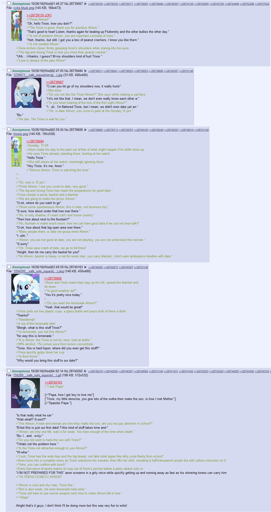 >>42583947>"What?">"Trixie does not care to repeat herself, perhaps you should be more attentive when she decides to speak to you. hmph.">"...Trixie does he do stuff like that alot?">"Well..Trixie isn't sure, is that not normal?">...>Anon gave Trixie a troubled, uncomfortable glare.>Normally the green boy had a blank expression on his face >Its half the reason she enjoyed his company, he didn't frown, scowl, roll his eyes or scoff at her like some of the others did>Trixie felt uncertain>"You wanna go on a date?">"Tri-wha..what?" she asked flustered>He never spoke first, never asked anything of her, the other half of why she liked him>"Yeah. Dinner or a movie, something like that. just you and me.">"Trixi...um.. yes trixie would like that.">Anon nodded and his face dropped to that same blank expression>Anon needed to protect this girl >He thought helping her out would be enough>He thought being her friend would be enough>But clearly he needed to do more.