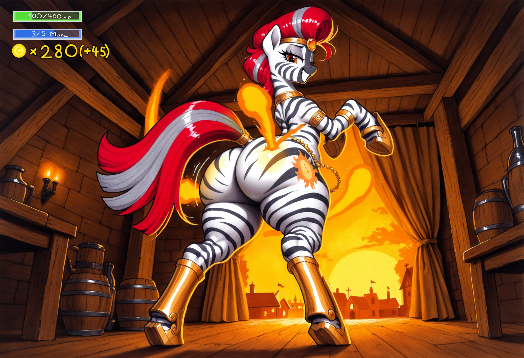 >>42604640>>42604968>>42606840Even if you're not necessarily done for the day, you decide to take a like break after this adventure and go for some refreshments at the tavern along Chara and Brass Compass."A toast to another successful adventure!" You raise your glass of veggie juice. "Even if my music couldn't do much to charm this spider, today. At least, it seems like you appreciate the enhancements from my magic, Chara. How do you like the new body?""Well, seeing your big friend I had a few doubts, but it's not bad." She smiles. "Not bad at all! I kinda expected to lose a bit of balance being under that kind of magic, but I'm as nimble as ever. Even with the…" Even on her seat, the larger mare can bump into you with her now meatier rump, pushing you a couple inches away. "…special treatment you gave my derriere. You have some funny definition of an 'enhancing' spell, Hearty.""W-well, aesthetic sense is what powers my music, and therefore my magic." You explain, which is no lie after all. "But more importantly, I'm very interested in your dancing and how you cast magic with it. Where did you learn that? Did you choose fire as an element or was it determined in some way?""Like I said, it's a traditional way for zebras to wield the elements. I learned it back at the capital. I mean, back in the zebra lands, years ago." Chara explains. "As for why I'm a scion of fire in particular, it's a bit of both things you said actually. Nothing stops you from learning how to wield more than one element, but the moves and mindset are very different for each of them. Most scions specialize in the one element they are the more attuned with personality-wise as a result, but for example my teacher had mastered the dances of fire, wind, water, sand and earth. As for why I dance with fire, it's just that it's the element I'm more in tune with. Wild, uncontrollable, alluring and bursting with energy, these are my kind of moves!""Fascinating!" You react. "So you’re not just a battle mage, but also a skilled artist.""Indeed!" Chara proudly nods. "Scions are both elite entertainers and warriors. I can withhold my burn from hurting bystanders when I dance if that was your question."“I would love to perform with you, then!” You excitedly tell the zebra. “Let us display our joined talents at the tavern tonight!”“Heehee.” She smirks at you. “So you wanna see that rump shake so badly, huh?”“Well…” She’s more on point that you’d like. “That would be the result of our cooperation already in action, in a way, so…” “Oh, don’t you worry.” Chara performs a sensual arch of her back while spinning on her stool. “I do’nt mind. Ogle me if my beauty commands you. And I have no qualm against turning the heat on tonight either. Just make sure you have a hot enough tune to match.”"Will do!” You nod with a smile, looking forward to it.