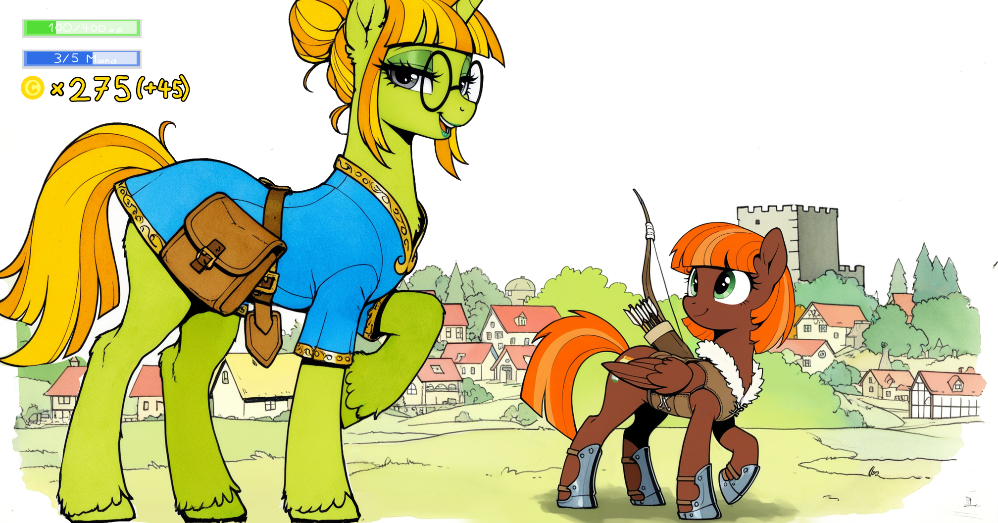 >>42610879Anyway, before anything you must meet the other pony that signed up for this quest, and the two of find her around the tavern.“Greetings.” The elf mare in armor salutes you, sounding slightly aloof. “Let us work together to make the roads safe again.”>You may discuss with your companions as you embark on this adventure to get to know them better.