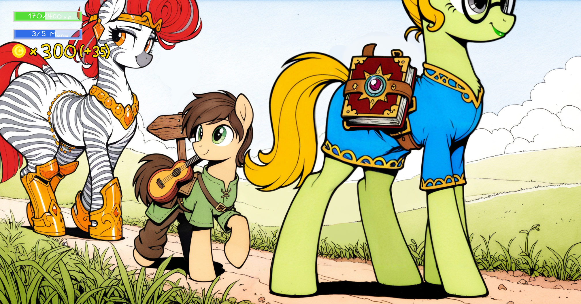 >>42594840Sorry, a bit late>>42590968>>42591895>>42592711>>42592900"I'm sad to hear that." You tell the buff zebra mare. "But you know, I don't think it's possible to always be in total control of everything. Especially in our line of work. As adventurers, confronting the unexpected is our daily grind after all. Just like the other day, I and some other adventurers were faced with an evil skeleton, and at this moment our mage companion couldn't find her banishing spell fast enough, and so the mean bones took a bite at another one of us. But that didn't stop out party, and when magic couldn't, a hearty swing of a pickaxe brough the undead down. And so the quest was a success in the end! Just like ours. What I mean is… don't feel down because of a single mishap. That happens to everypony, and taking you out of a bad step is what companions are for. Also, once you were cured from the sleep spell back then, you kicked that big fae down better than the rest of us ever could. How are you doing with that new body of yours, by the way? I figured a brawler like you would make the best of my enhancing music.""Hum, it definitely improved my capacities." Star Flow nods, hardly repressing a proud smile, and then takes a few glances around before whispering the next part to you. "It's permanent, right?" And after you nod back. "Mh, I wasn't sure at first. Of course, a master of the Flowing Hoof will be a formidable warrior regardless of its size, but at my level at least, this is a huge boost for me. I can't spar with my fellow disciples as usual anymore, not without having to hold my strikes back at least, so the Master offered to train with me while this lasts instead. I feel a little like I've cheated my way through a couple years of physical strengthening, and I plan to make the most of what he teaches me and to be worthy of this chance. I… I should thank you, Hearty. I wouldn't have such an occasion on my hooves without your help.""This my pleasure." You smile at the bulky zebra. "Anyway, my offer still stands. And even if you don’t want to accompany me on a trip or on a quest, you can always join us for a drink at the tavern tonight. No need to answer me yet. We'll have a spare seat for you.""Alright then." Star Flow nods. "I'll think about it.""I hope to see you tonight." You say as you leave.But before you can taste victory and ale, there's some adventuring work to be done. Namely, spider extermination. How very mundane for your trade to vanquish dangerous creatures for the sake of the local lord.Brass Compass accepts to accompany you on this by-the-book errand, and you meet the other mare that signed up for it."Hey there." The zebra waves at you as you approach "I'm Chara. I'm ready to turn these spiders to ash…" And as she looks up to you very tall friend. "Unless you plan to squish them first maybe? Both will do.">You may discuss with your companions as you embark on this adventure to get to know them better.