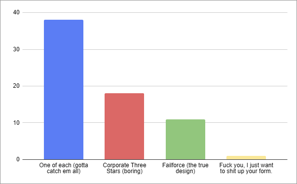>>42697003See >>42646184 and see if you can figure it out ^:)most want one of each, Corporate ran out and there are still Failforce over even when covering everyone who only wants a Failforce