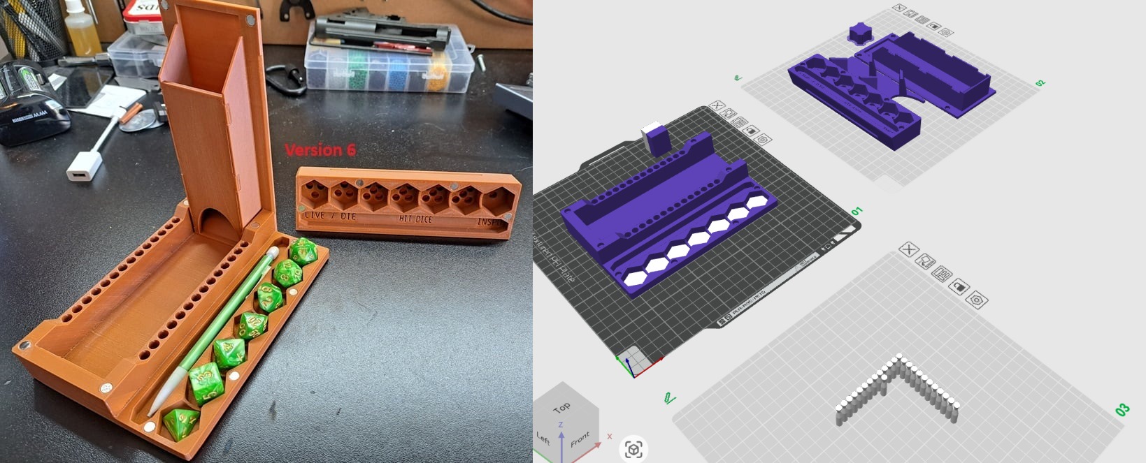 >>42673699Found a better Dice case, and this one has a removable top that becomes a mini tower and tray. Gonna do Purple body with White Lettering and pegs.
