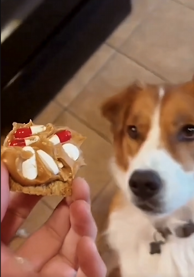 Trixie being fed her favorite snack, totally normal peanut butter crackers