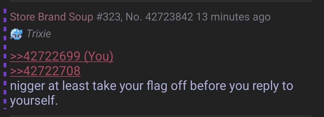 >>42722699>>42722708Nigger at least take your flag off before you reply to yourself.