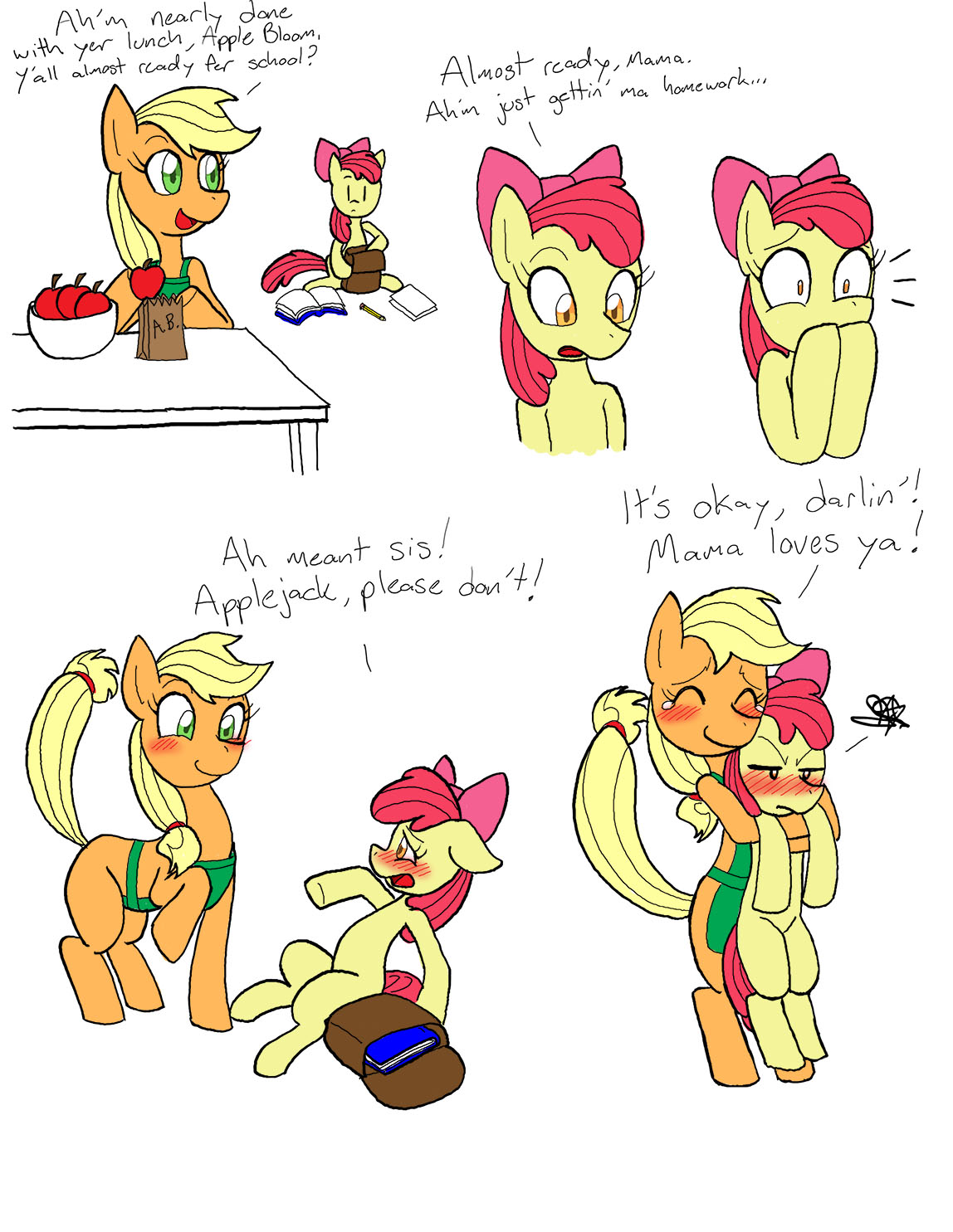Little does Apple Bloom realize that Applejack is actually her mom, and Big Mac is her dad.