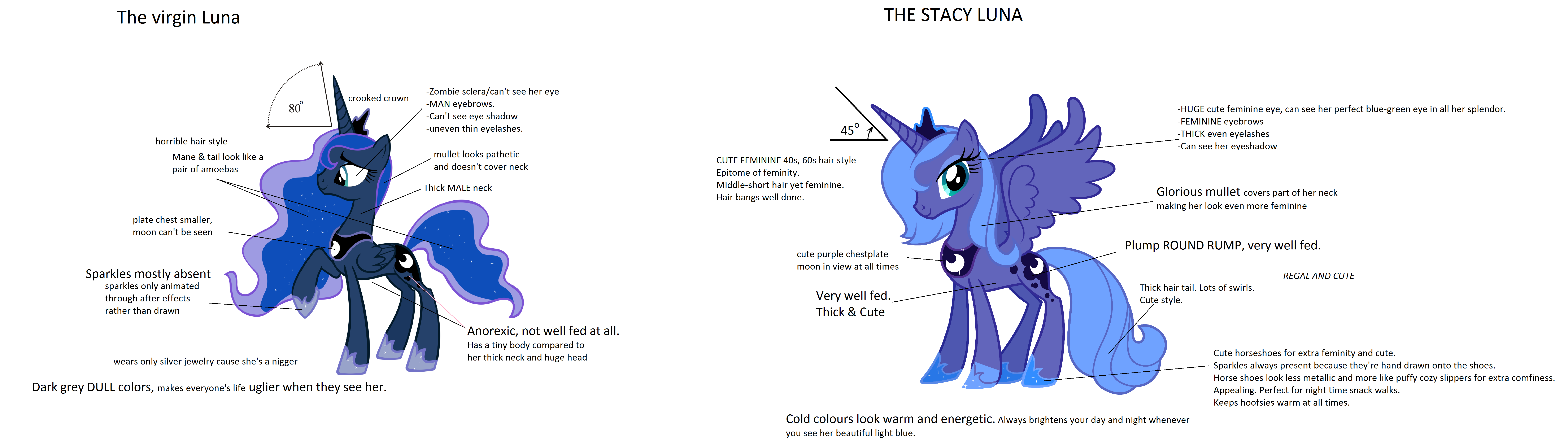 >>42713026The main issue with Woona's design is that it lacks the "edge" (for lack of a better word) that Luna has. It is very cute, yes, but Luna isn't just cute. Celestia is cute, but also regal, and her design manages to convey both things. In the same vein, Luna should be cute, but also "edgy"/intense, and that's where her S1 design falters, since it just makes her way too bubbly to have that intensity. I don't even think this is particularly hard to fix, mind you. Just make her mane, tail and wings more angular and sharp, while slightly decreasing the size of the pupils and it would already go a long way to improving it.Just to be clear, I don't like her S2+ design, it looks stupid and I would've preferred her S1 design to be the official one. All I'm saying is that neither is good enough for Luna.