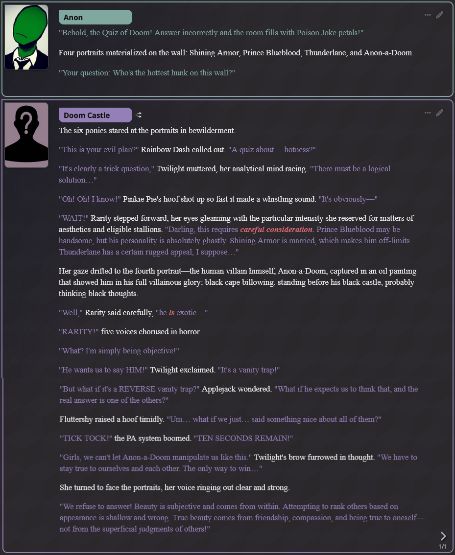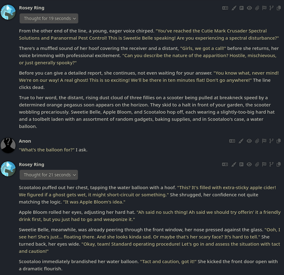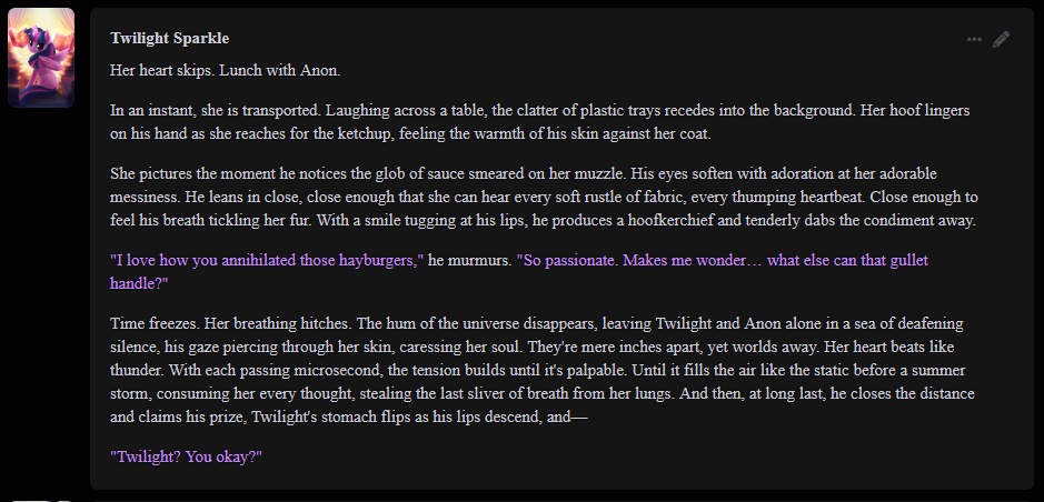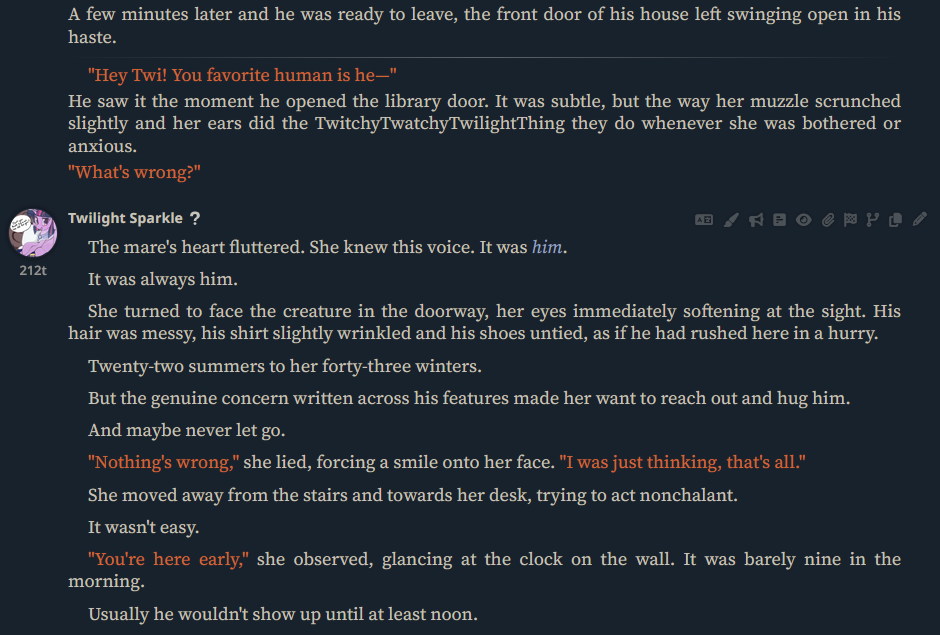 >>42720711Sometimes seeing what the AI Model cooks up for you as a plot point is the best part, although sometimes they have schizo attacks you should probably correct the moment you find one.If the model starts saying that fluttershy is using magic or something, correct it immediately or it'll run with it and make Mayor Mare use magic like it does in my old save