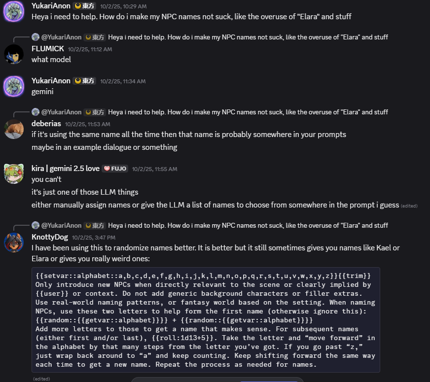 >>42719040>While mode collapse is semantical. If you penalize token sequences, the model will just make up creative synonyms:>It's like trying to plug a billion holes with fingers. At best, it will transform one kind of isms into another.That's correct. you can see this behavior here >>42670945 and >>42662897In a lot of cases trying to banning slop is a waste of time, because each model is deterministic it will just pick the next most predictable result instead of an uncommon one like you want. Anon's asked what I was doing to deslop intros and I abandoned banning pretty fast, because I saw it was an effort in futility.Instead I stacked the deck on being more random thereby forcing it to be more unpredictable through random choices. There are some preset makers that figured this out, like Knotty pic rel, (I've personally run into swipes reusing names way too much)though otto may have been an attempt at a true randomizer, there was some old presets that used something similar like "chose 2 random words, and form your reply around it" with mixed results. I think aiming for a controlled randomness is better, set variables yourself and fill it up with as much as you can. It's much better than just letting the model be lazy using the most common stuff.