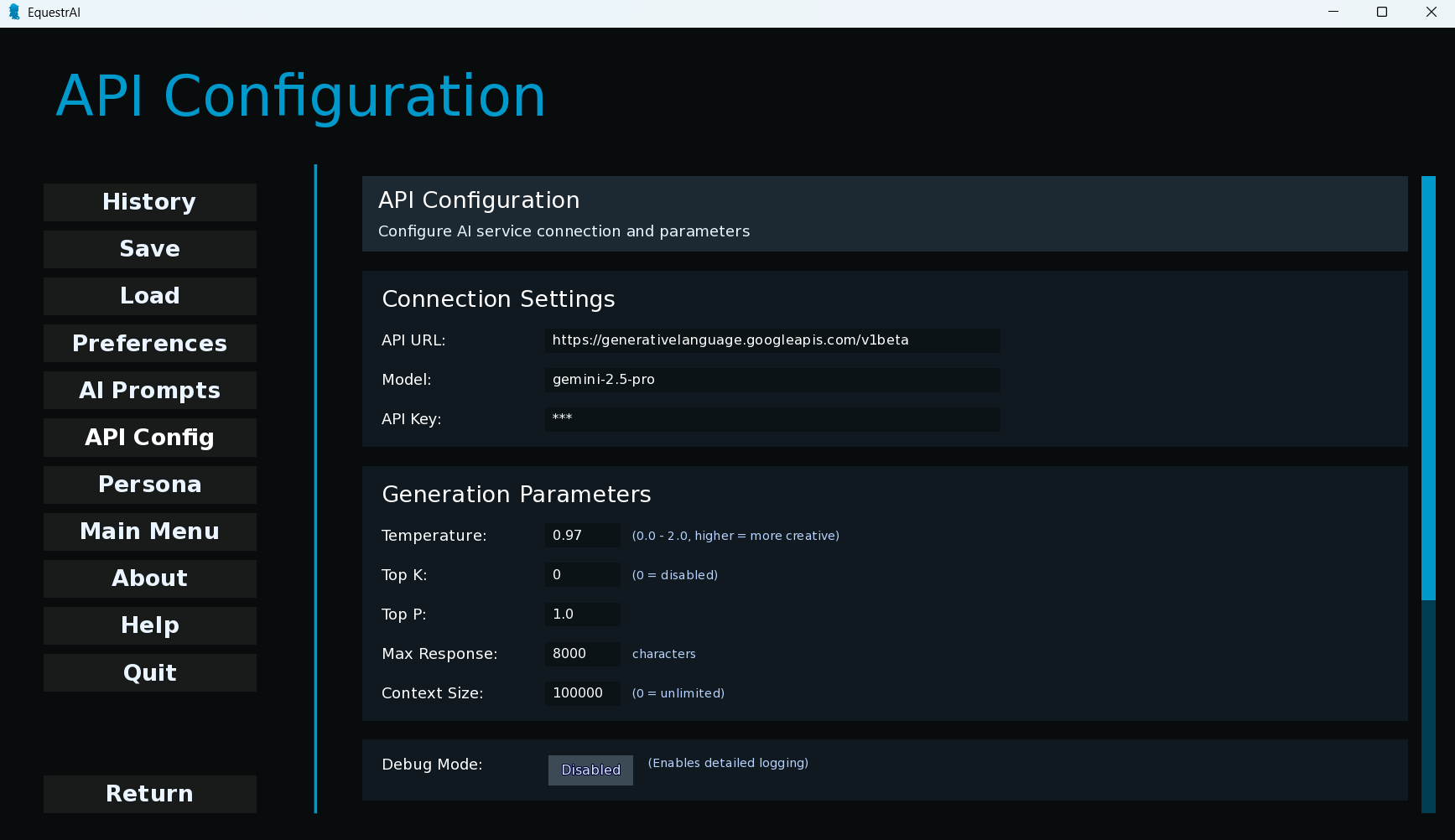 >>42720159 Keep everything like this in this screen. Go here to create an API key for Gemini: https://aistudio.google.com/apikey You get 50 requests per day, but you can create several keys to switch between once one hits its limit. With 4–5 keys, you should be fine, here how to do this:Go to https://console.cloud.google.com/apis/, click on your project name in the top bar, and select "New Project" to create more. Then, return to the AI Studio API Keys page and generate keys for each project. Switch between them as each one reaches its limit. Finally, paste the API key into the API key field in the VN and save the config.