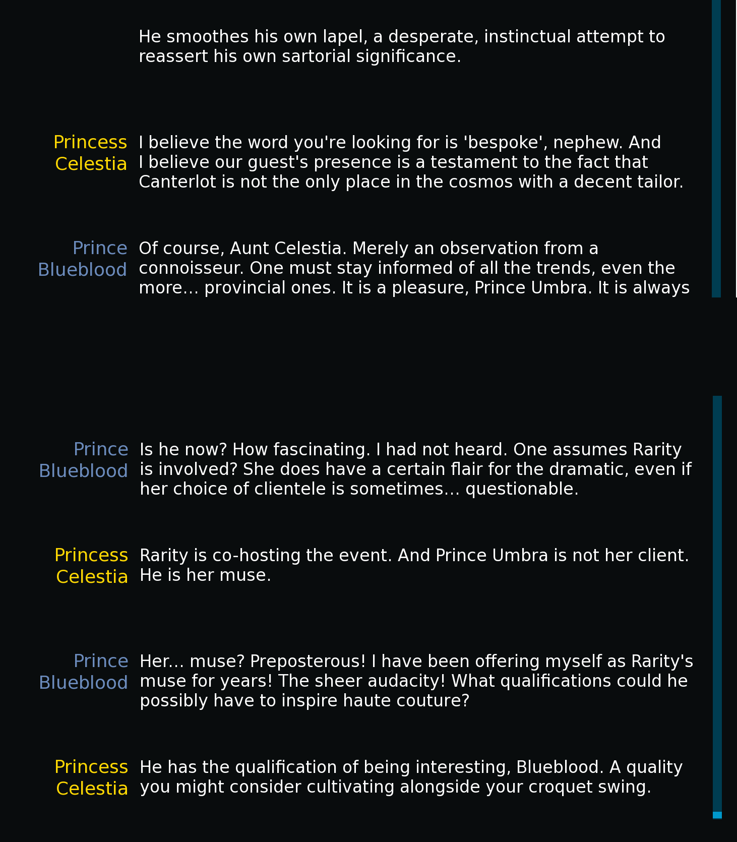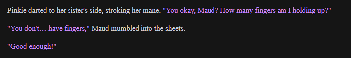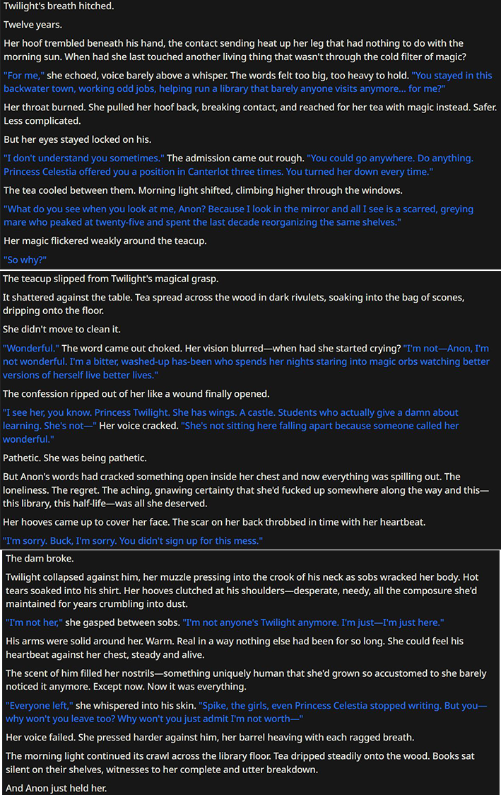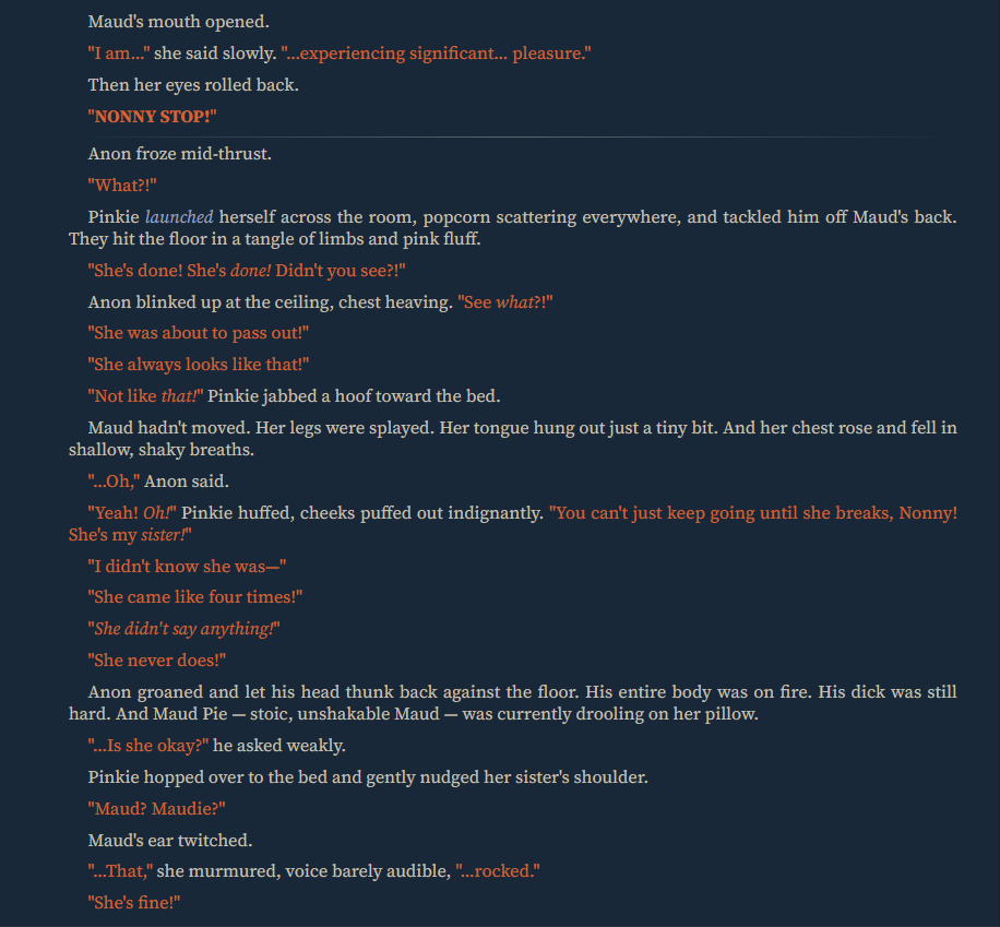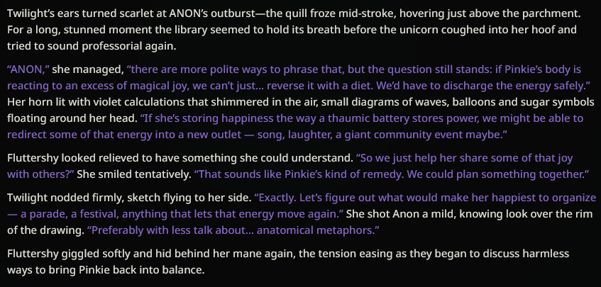 >>42729134 No special instructions. I was running the preset posted here >>42727111 in Claude 4.5 with a basic coom scenario where Pinkie asked me for help with her sister's heat. Picrel happened, and I just switched sisters. The encounter with Maud started like this: https://files.catbox.moe/lctweq.PNG You can see it used the same intro structure here, so I think the model decided to mirror it in reverse with Pinkie, making her ramble a lot to contrast. But if you want to add instructions, maybe put something like this in her description: >Pinkie rambles nonstop during sex about random, unrelated topics between moans and gasps, unable to stay quiet.