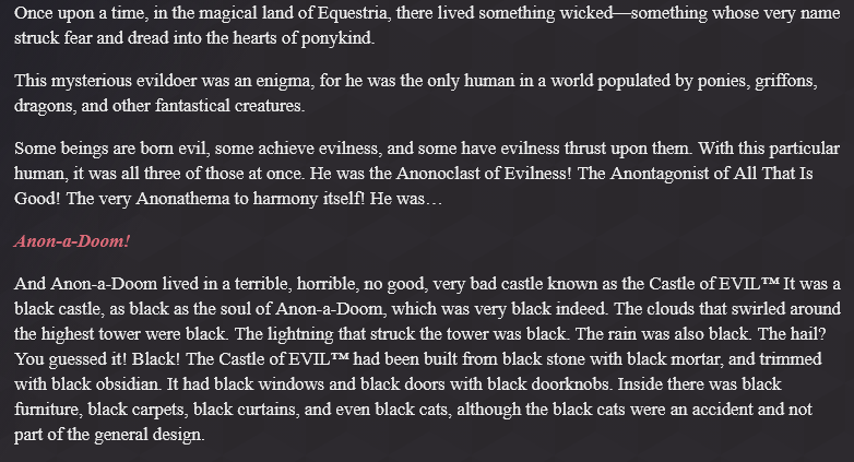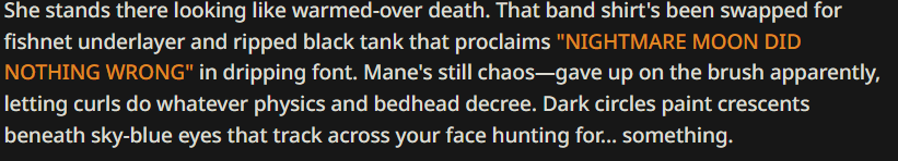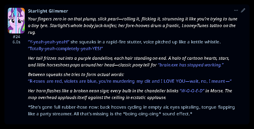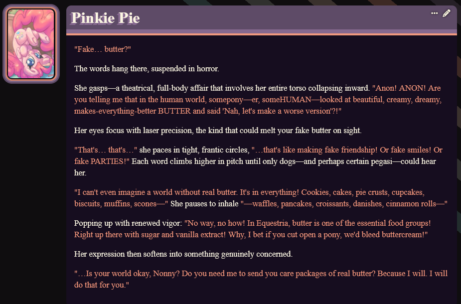 >>42732062bro Im fucking dying, I just wanted to goon to AI but I've been laughing and wheezing like a retard for the last 15 minutesNote that my persona is a earth pony and I've never mentioned anything about humans, the AI must have figured it out itself lmfaoo