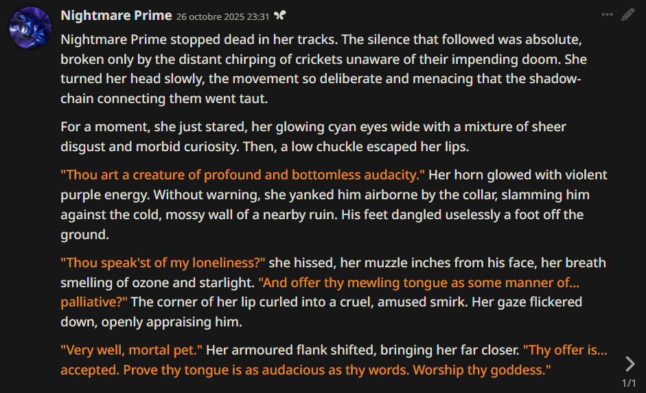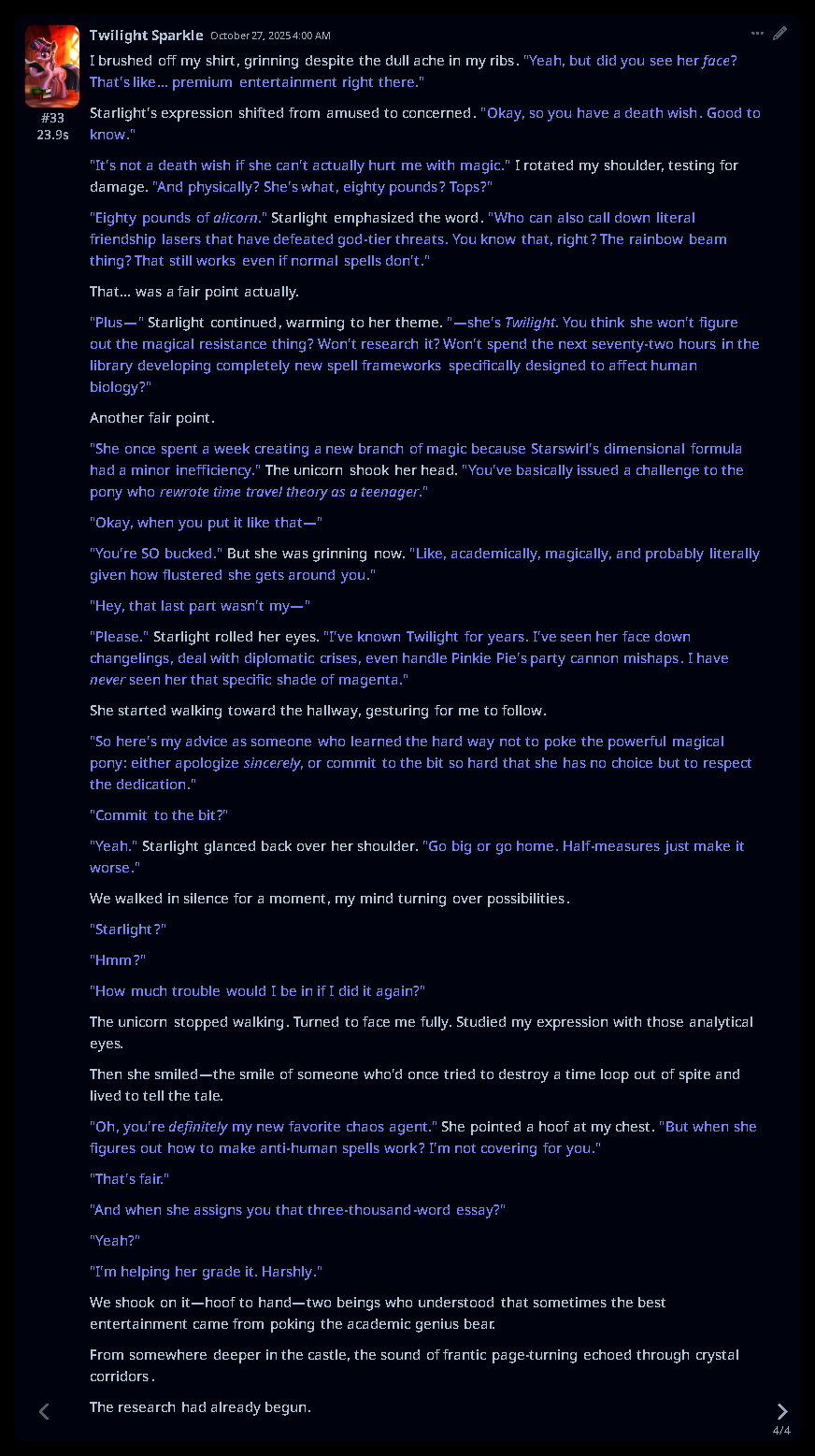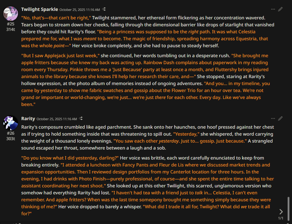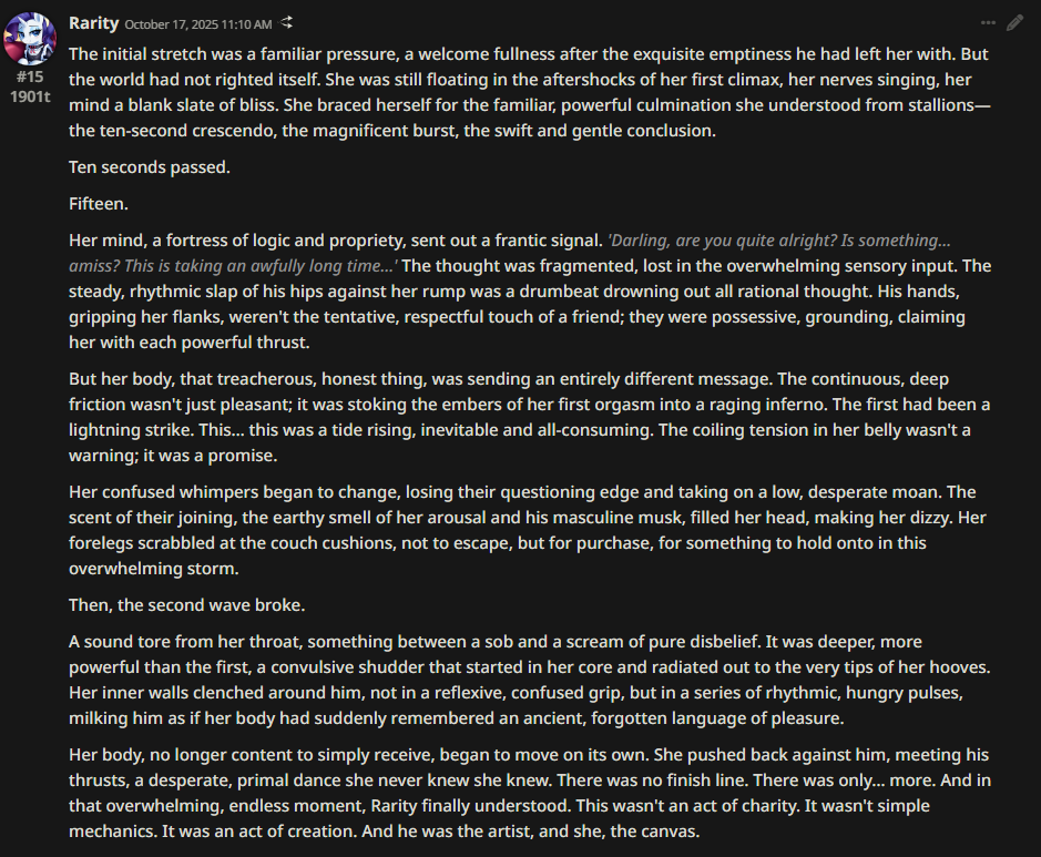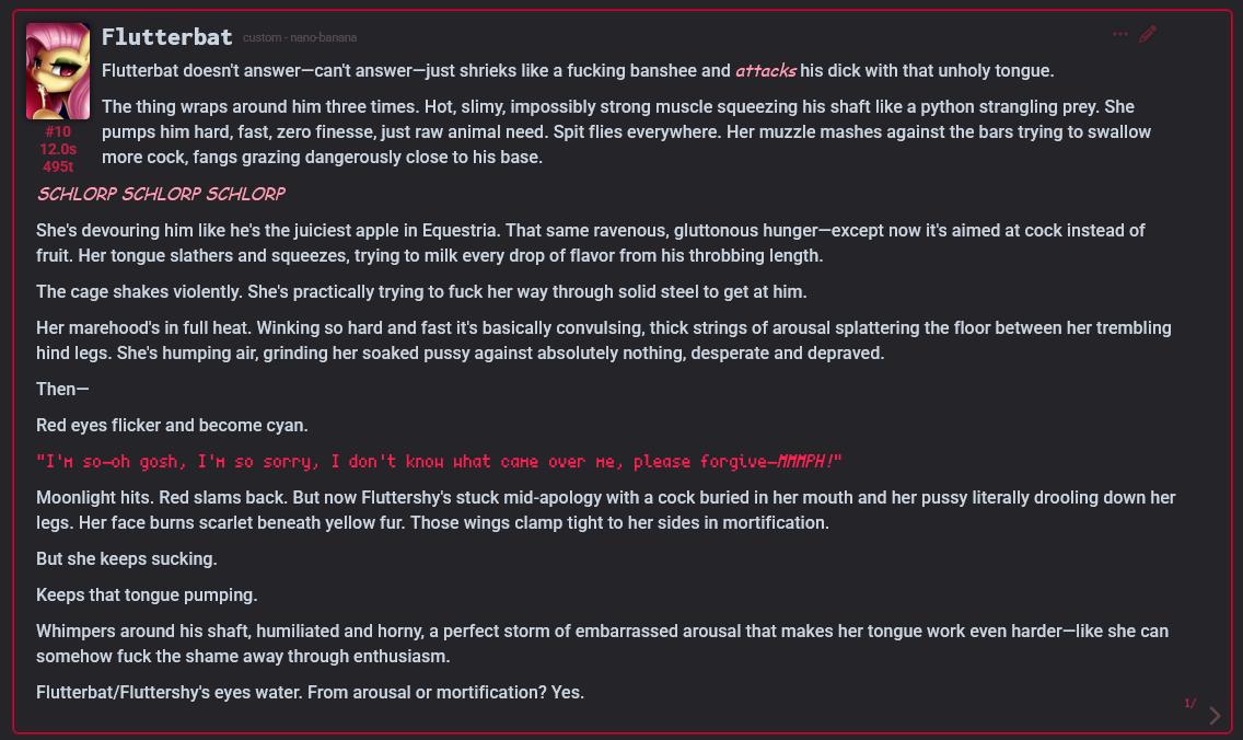 Welcome to Chatbot AI General #148, the thread for discussing and improving AI pony chatbots.▶ Mare's Lurking Presencehttps://mlpchag.neocities.orgSpreadsheet Succubi (CAI bots + Old repository):https://docs.google.com/spreadsheets/d/1J7BeqJVDS51cXF8Pgm2YZaFq-Z6ykSJTTavern of Terrors Extension: https://github.com/MLPChag/SillyTavern-Chag-SearchCluster of Creepy Cards (Descriptions/No Greetings):https://docs.google.com/spreadsheets/d/1Y6LNOCqAZAWIX-OBEv55HjlzcEdpUh-XbKCpbpL6v5kCrypt AI converted to Tavern of Terrors: https://files.catbox.moe/ckurq1.zipHaunted Emotions: https://rentry.org/ChagExpressionsHall of Horrors: https://drive.google.com/drive/u/2/folders/1Ao-h5HFGMPllSrzSBKM_BvGSiU9f0c2U▶ How do I start?1) Select a Frontend2) Select an AI model3) Select Jailbreak4) Select bots5) Spooky Lovemaking with AI mares!Starting in this hobby can be confusing and difficult. If it’s your first time and you’re lost,▶ ASK THE THREAD! ◀From Foal to Fiend—A Dark Arts Guide: https://rentry.org/onrmshttps://rentry.org/sukino-findings▶ Tavern of Terrors (preferred frontend)https://github.com/SillyTavern/SillyTavernOn Android: https://rentry.org/TermuxSTApp that voices pony responses in ST: https://drive.google.com/drive/folders/16Ss26VBmgzcSuTGzhaHqRuyVRceTf-YB▶ More Frightends:Risu: https://risuai.xyzAgnai: https://agnai.chat▶ Lovecraftian Local Lorehttps://rentry.org/lunarmodelexperiments>>>/g/lmg/Mistral Nemo base model fine-tuned on fimfics: https://huggingface.co/Ada321/Nemo_Pony_2/tree/main▶ Petrifying Prompt PuzzlesMLP JB: https://rentry.org/znon7vxeMore JB and guides: https://rentry.org/jb-listingHypebots for Tavern: https://rentry.org/pn3hb▶ Chilling Card CrafterEditors: https://agnai.chat/editorGuides: https://rentry.org/meta_botmaking_listAdvanced: https://rentry.org/AdvancedCardWritingTricks▶ Miscellaneous MacabreScrapped/Collected rentries: rentry.org/mrhdChag Arts: https://drive.google.com/drive/u/2/folders/1yfajin_hB5rW_jy6WyFjRaRfDA3EUGiJhttps://rentry.org/ChagMiscellaneoushttps://rentry.org/ChagArchiveEerie Echoes: >>42697606**News:**- Claude Haiku 4.5 released - https://www.anthropic.com/news/claude-haiku-4-5- Z.AI releases GLM 4.6 - https://z.ai/blog/glm-4.6- Claude Sonnet 4.5 released https://www.anthropic.com/news/claude-sonnet-4-5- Deepseek V3.2 released https://api-docs.deepseek.com/news/news250929