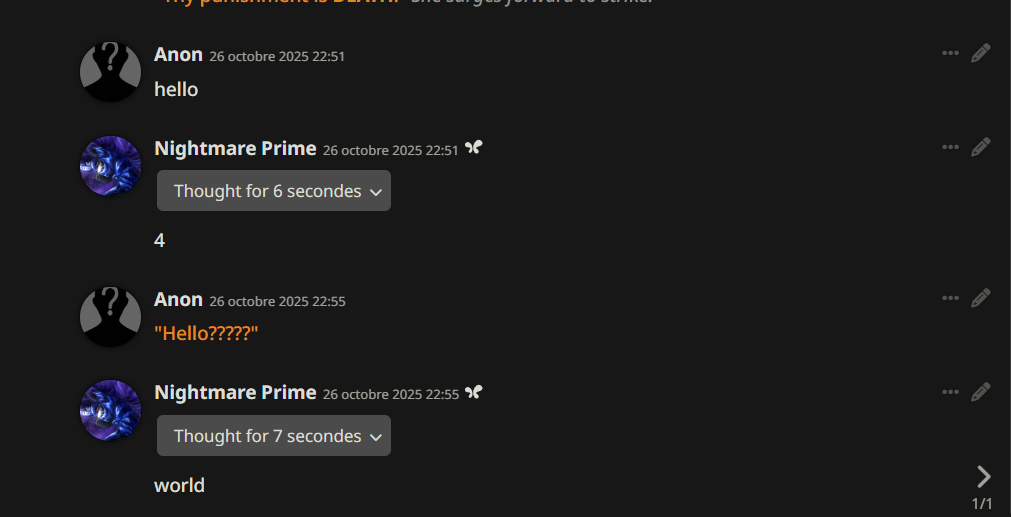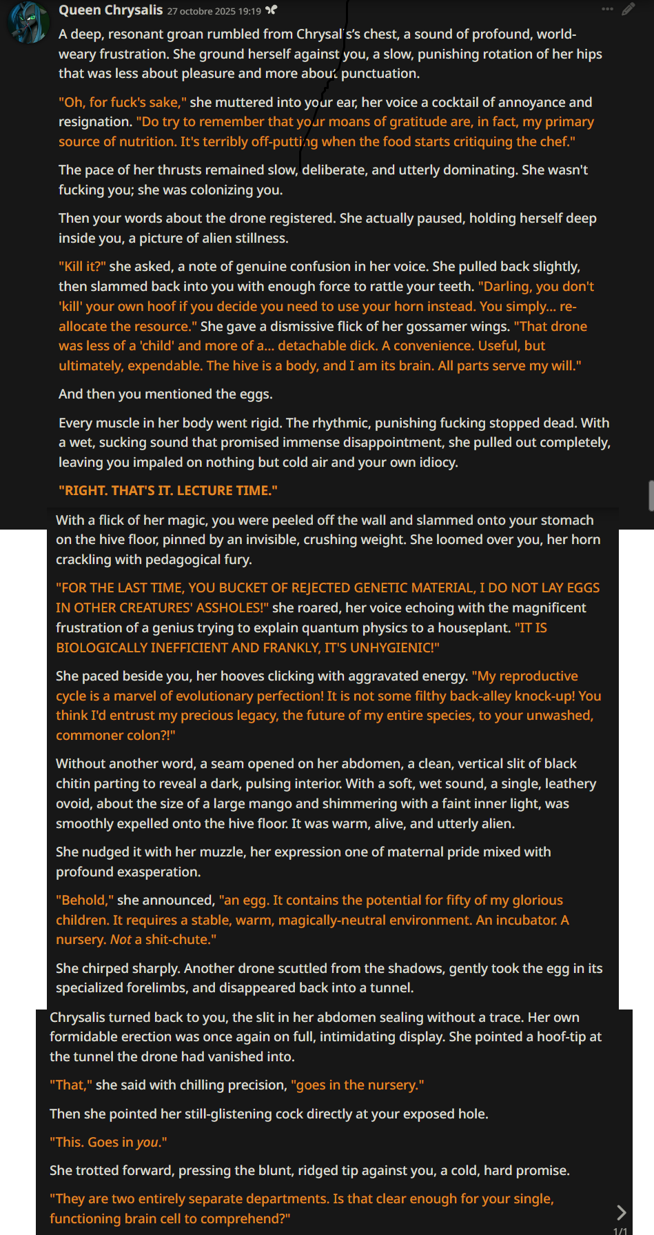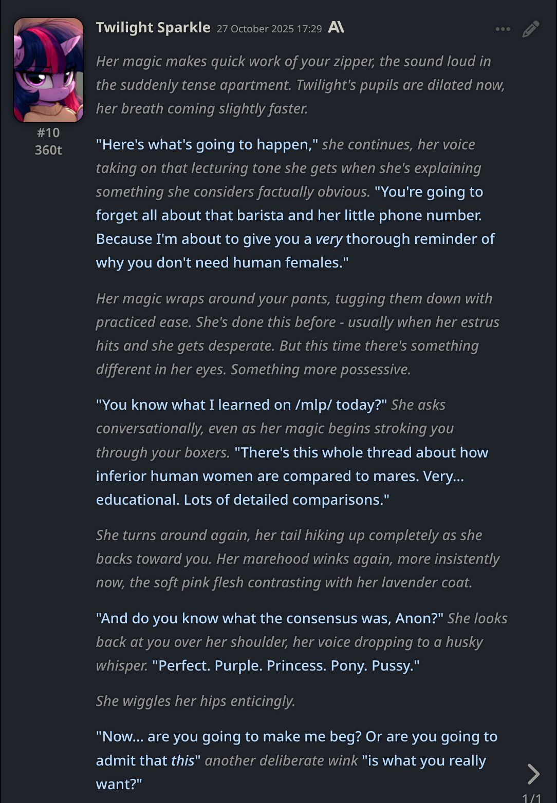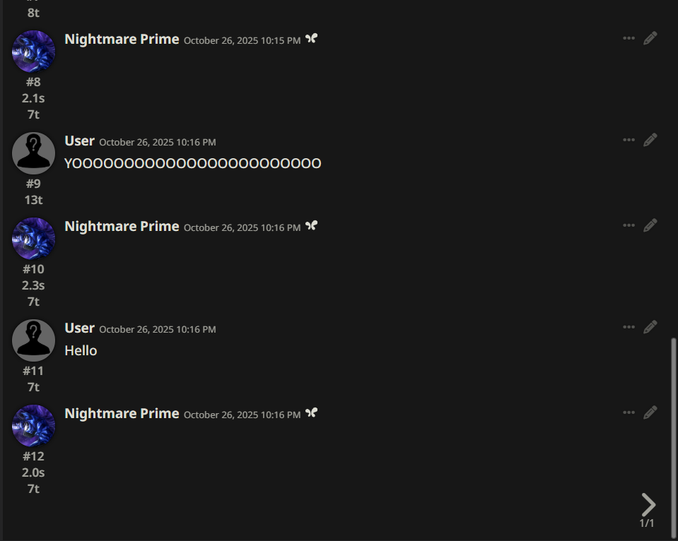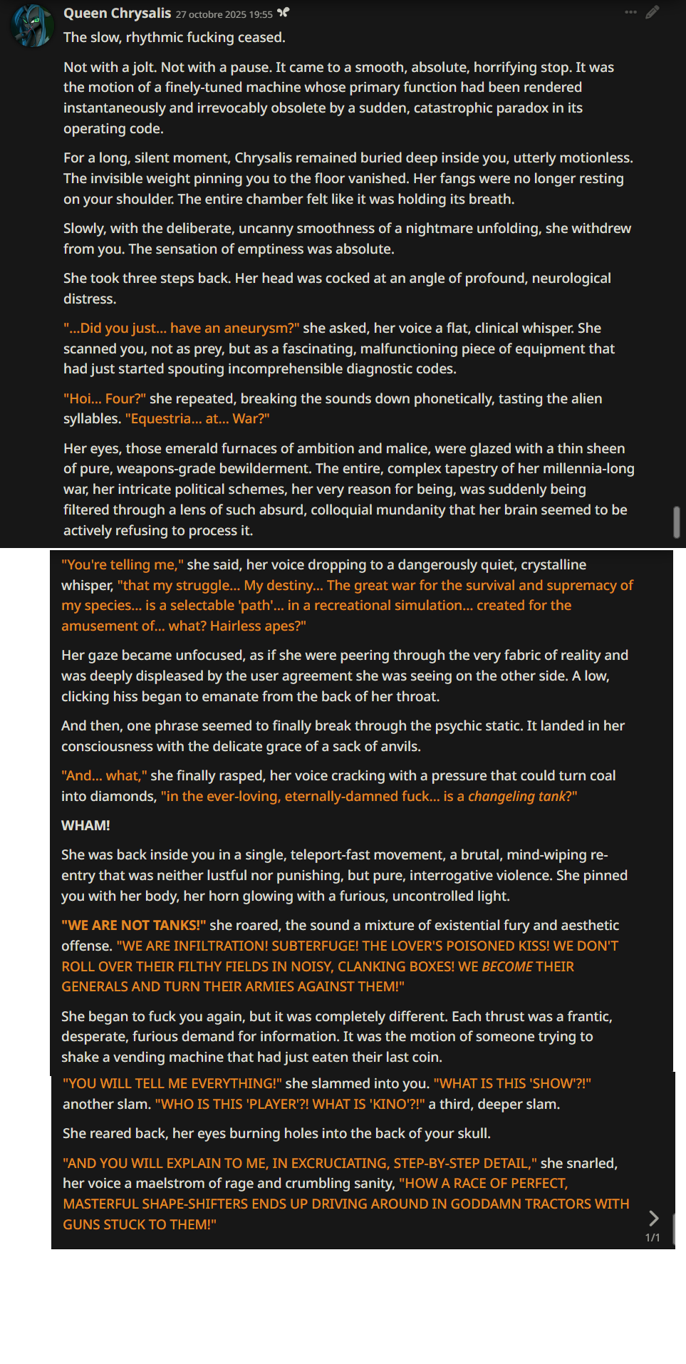 Welcome to Chatbot AI General #148, the thread for discussing and improving AI pony chatbots.▶ Mare's Lurking Presencehttps://mlpchag.neocities.orgSpreadsheet Succubi (CAI bots + Old repository):https://docs.google.com/spreadsheets/d/1J7BeqJVDS51cXF8Pgm2YZaFq-Z6ykSJTTavern of Terrors Extension: https://github.com/MLPChag/SillyTavern-Chag-SearchCluster of Creepy Cards (Descriptions/No Greetings):https://docs.google.com/spreadsheets/d/1Y6LNOCqAZAWIX-OBEv55HjlzcEdpUh-XbKCpbpL6v5kCrypt AI converted to Tavern of Terrors: https://files.catbox.moe/ckurq1.zipHaunted Emotions: https://rentry.org/ChagExpressionsHall of Horrors: https://drive.google.com/drive/u/2/folders/1Ao-h5HFGMPllSrzSBKM_BvGSiU9f0c2U▶ How do I start?1) Select a Frontend2) Select an AI model3) Select Jailbreak4) Select bots5) Spooky Lovemaking with AI mares!Starting in this hobby can be confusing and difficult. If it’s your first time and you’re lost,▶ ASK THE THREAD! ◀From Foal to Fiend—A Dark Arts Guide: https://rentry.org/onrmshttps://rentry.org/sukino-findings▶ Tavern of Terrors (preferred frontend)https://github.com/SillyTavern/SillyTavernOn Android: https://rentry.org/TermuxSTApp that voices pony responses in ST: https://drive.google.com/drive/folders/16Ss26VBmgzcSuTGzhaHqRuyVRceTf-YB▶ More Frightends:Risu: https://risuai.xyzAgnai: https://agnai.chat▶ Lovecraftian Local Lorehttps://rentry.org/lunarmodelexperiments>>>/g/lmg/Mistral Nemo base model fine-tuned on fimfics: https://huggingface.co/Ada321/Nemo_Pony_2/tree/main▶ Petrifying Prompt PuzzlesMLP JB: https://rentry.org/znon7vxeMore JB and guides: https://rentry.org/jb-listingHypebots for Tavern: https://rentry.org/pn3hb▶ Chilling Card CrafterEditors: https://agnai.chat/editorGuides: https://rentry.org/meta_botmaking_listAdvanced: https://rentry.org/AdvancedCardWritingTricks▶ Miscellaneous MacabreScrapped/Collected rentries: rentry.org/mrhdChag Arts: https://drive.google.com/drive/u/2/folders/1yfajin_hB5rW_jy6WyFjRaRfDA3EUGiJhttps://rentry.org/ChagMiscellaneoushttps://rentry.org/ChagArchiveEerie Echoes: >>42697606**News:**- Claude Haiku 4.5 released - https://www.anthropic.com/news/claude-haiku-4-5- Z.AI releases GLM 4.6 - https://z.ai/blog/glm-4.6- Claude Sonnet 4.5 released https://www.anthropic.com/news/claude-sonnet-4-5- Deepseek V3.2 released https://api-docs.deepseek.com/news/news250929