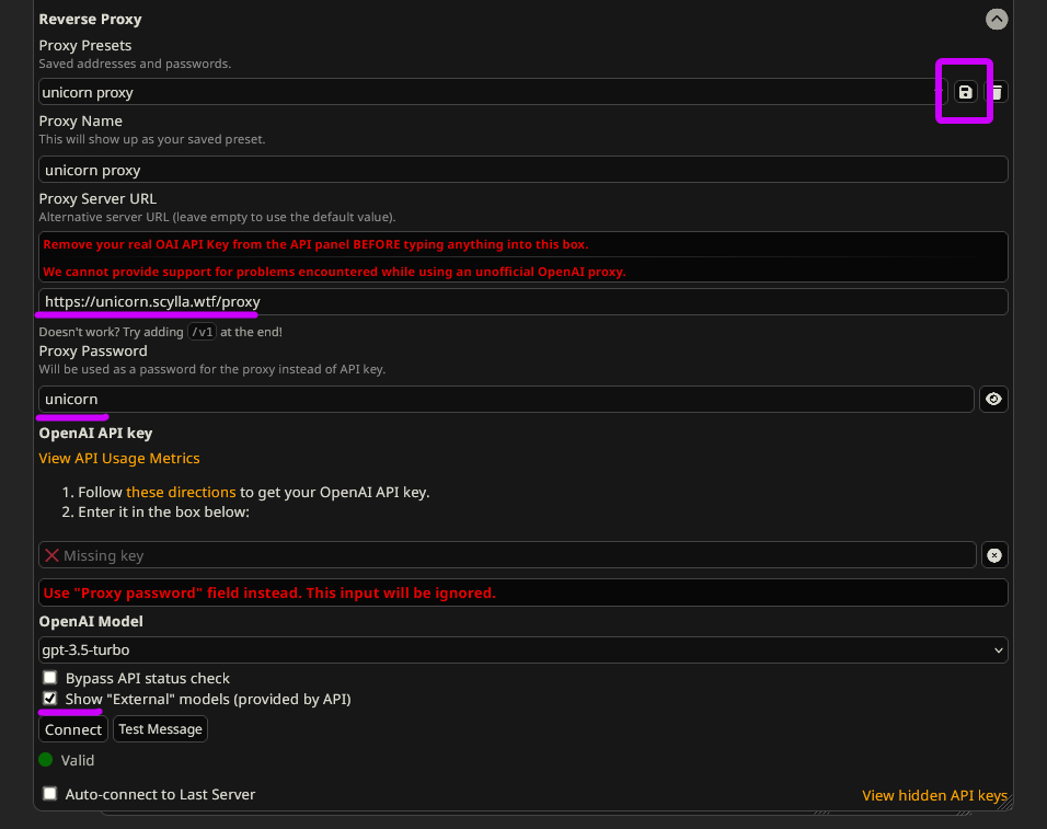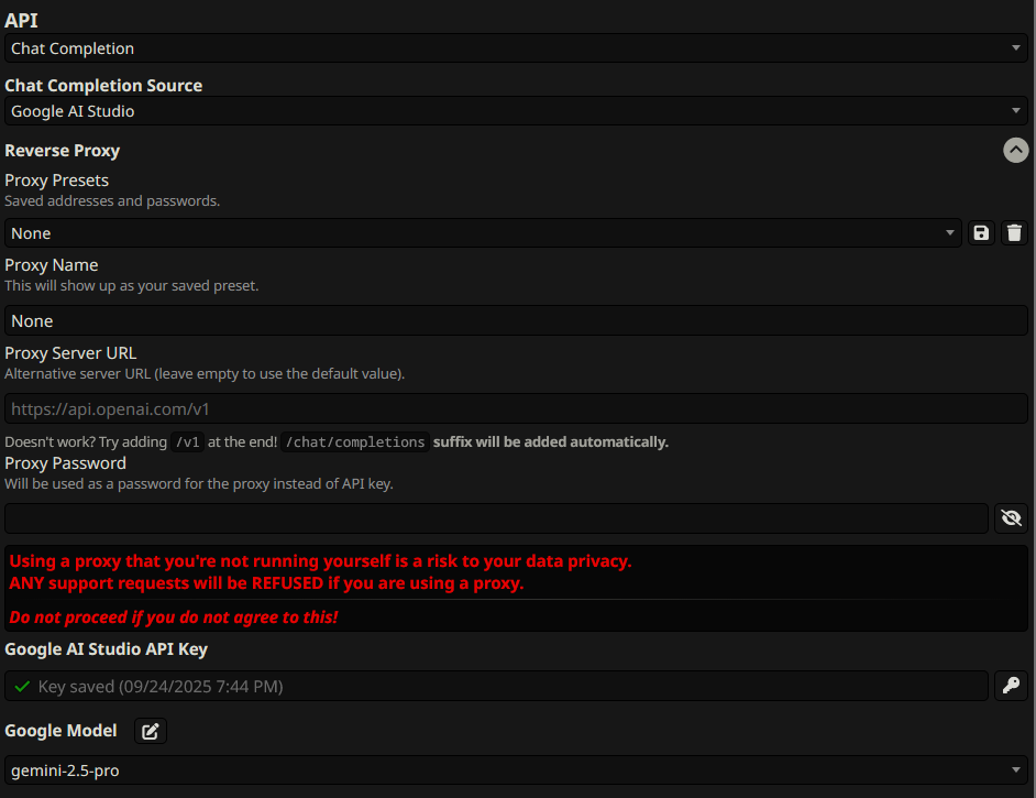 >>42728277You don't need a proxy URL for Gemini.Configure it like this, make sure the Reverse proxy part is empty. Just put your key in Google AI Studio API Key.