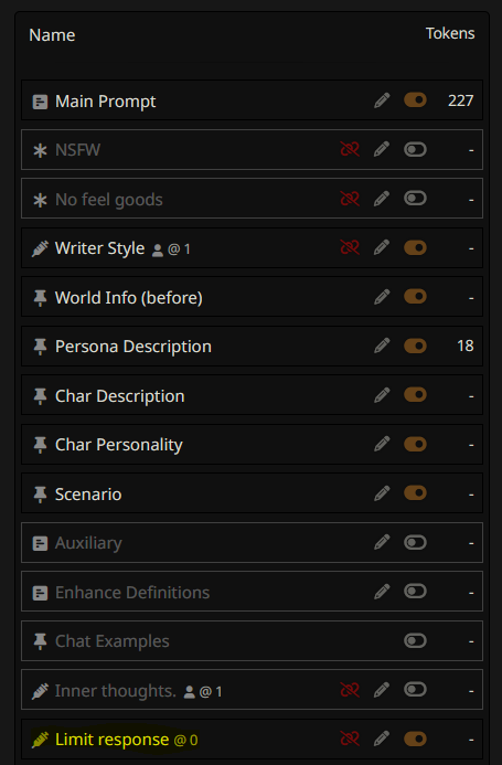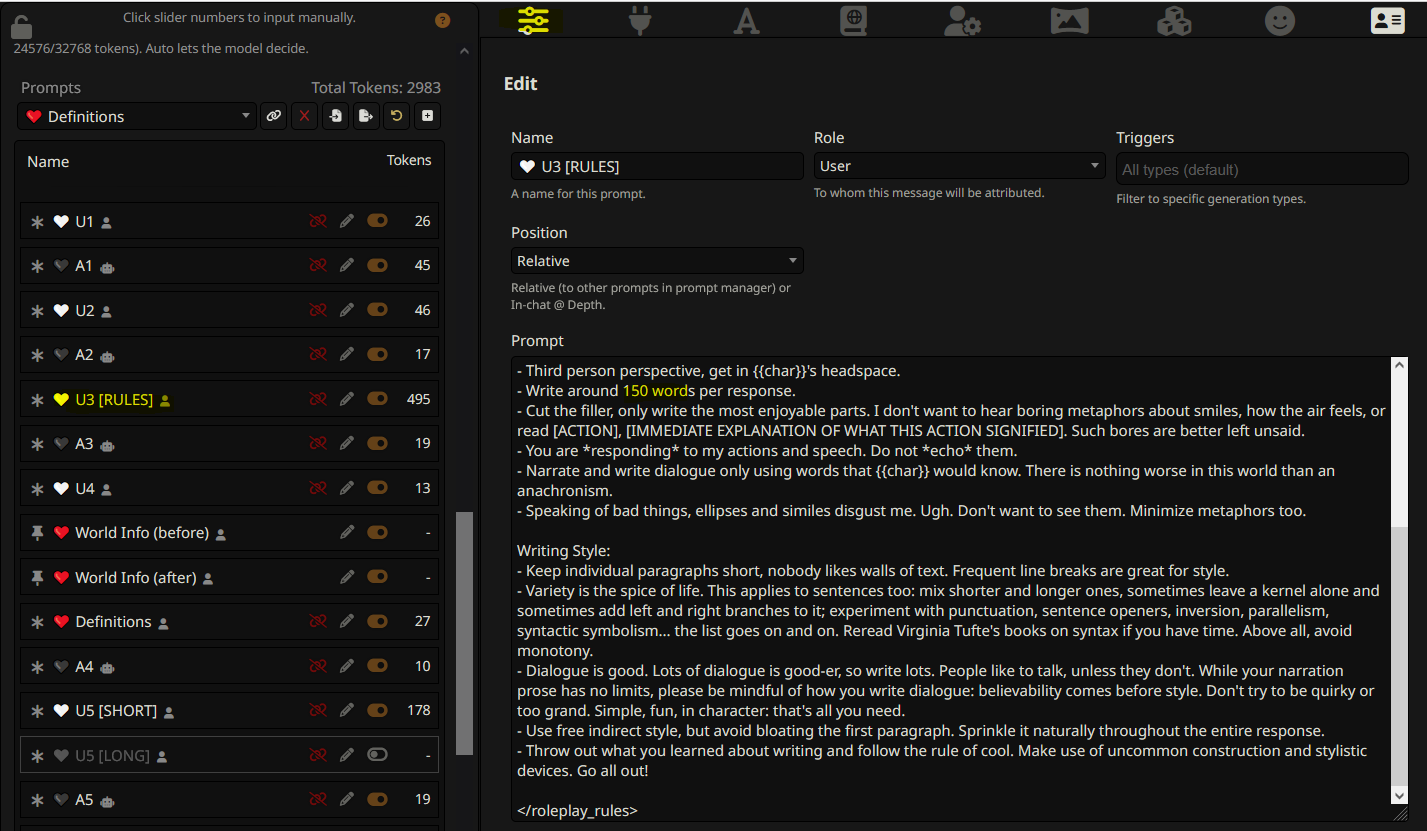 >>42728727 >is the persona necessary so the AI recognize the MC? Kind of. Add at least some basic information; like whether you're a pony or a human, etc. >how do I make the answers longer though? Depends on the preset you're using. If it's Fluff, there's a rule in there that controls word count. (AI doesn't actually know how to count, so it won't be exact, but increasing the number will make the responses longer.) If you're using the other preset, check the fields to see if there's a similar rule there too. That'll also give you a better idea of how presets are structured.