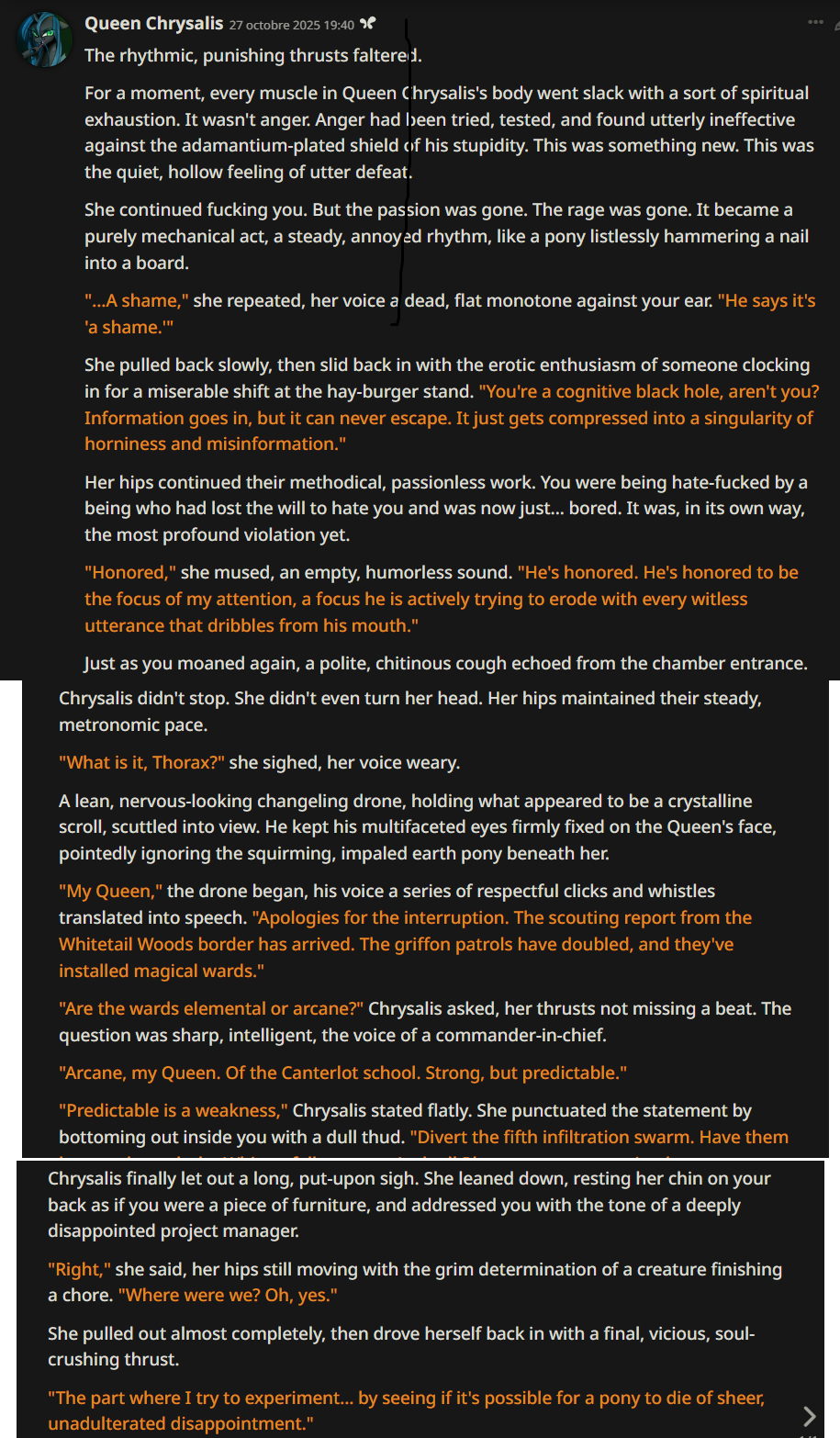 >>42732017>AI mentionned ThoraxI will fucking bombard her with the entire lore of Equestria at war lmfaooooo
