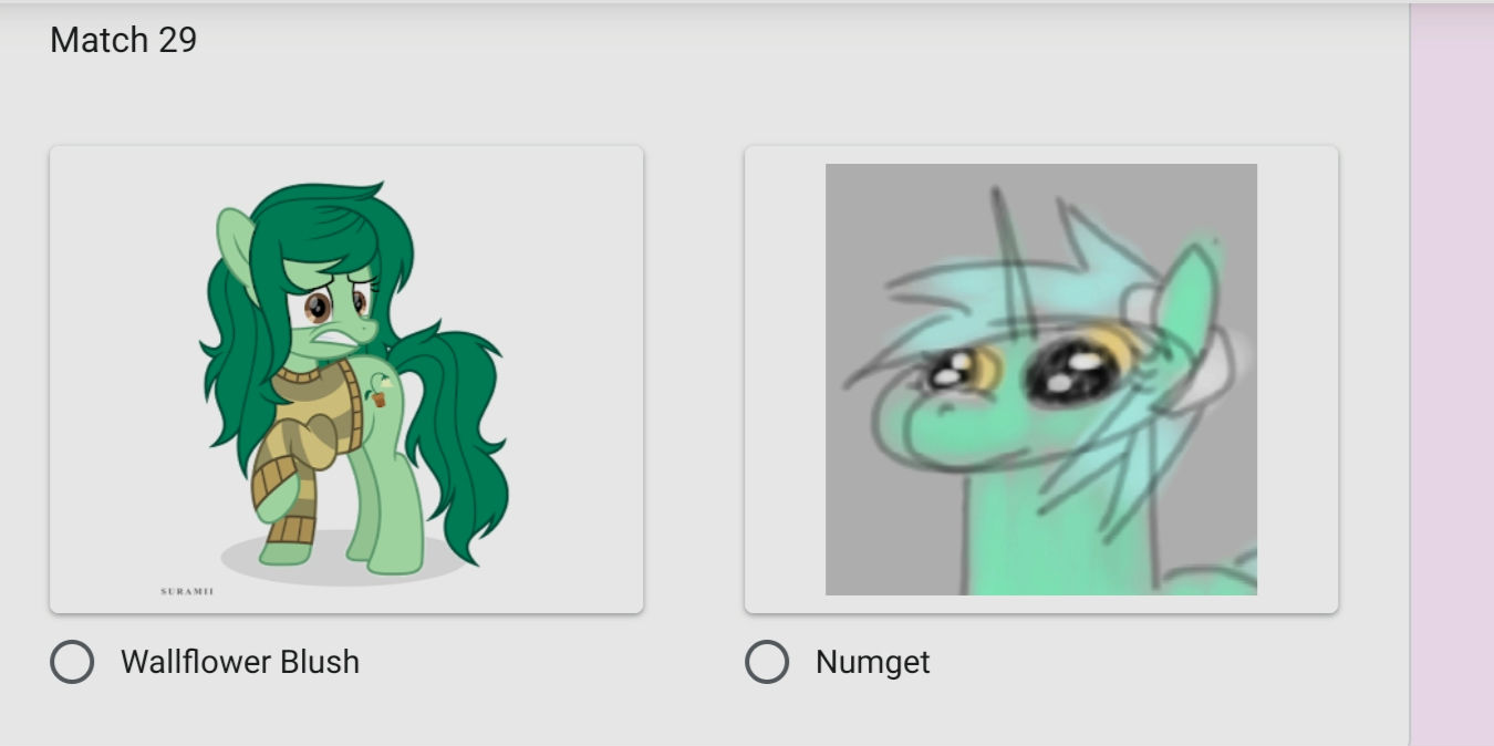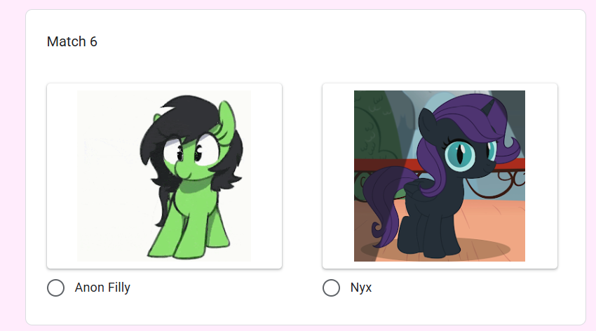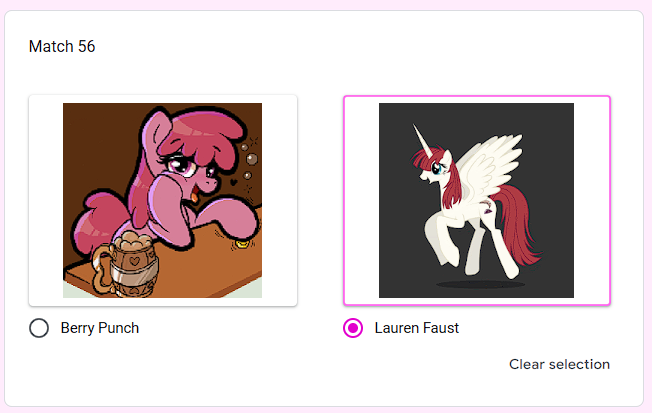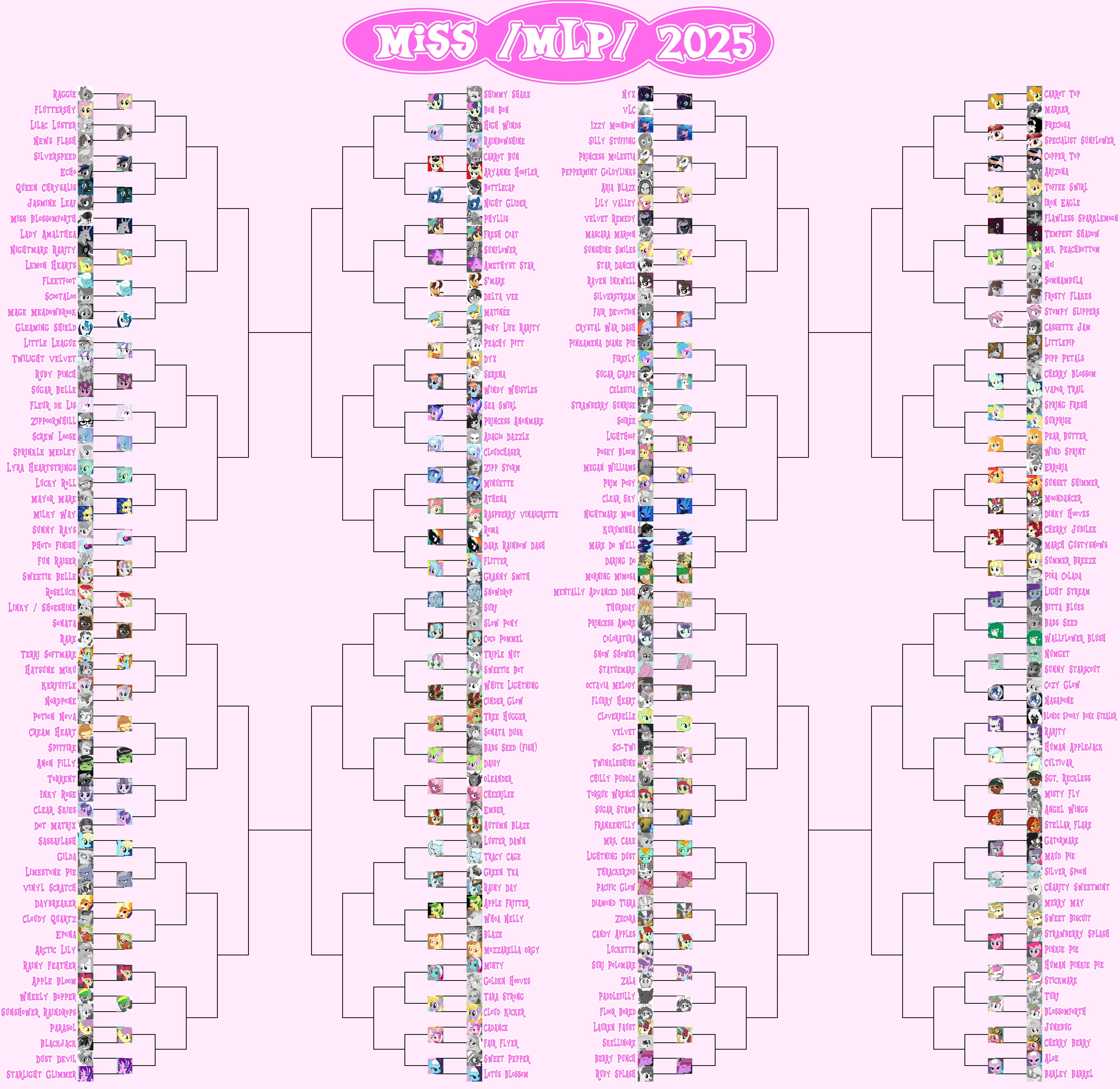 Welcome to the continuation of the 2025 Princess /mlp/ pageant, where your favorite ladies from across all aspects of the franchise be it canon, fandom, or memery are judged and selected for who is most deserving of being crowned board royalty.Half of all contestants are now out of the competition! It's a melancholy moment, saying goodbye to half our wonderful ponies (and non-ponies), but the other half still can win it all! Who are you rooting for?Vote below!Round of 128: https://forms.gle/K2n1NxQWL23VmRqi8https://forms.gle/K2n1NxQWL23VmRqi8https://forms.gle/K2n1NxQWL23VmRqi8Time until Round of 128 ends: https://itsalmo.st/time-for-the-round-of-128-to-end-ps6vPrevious Thread: >>42731667Apologies to PageantAnon and to all of you if I fucked anything up in the bake.