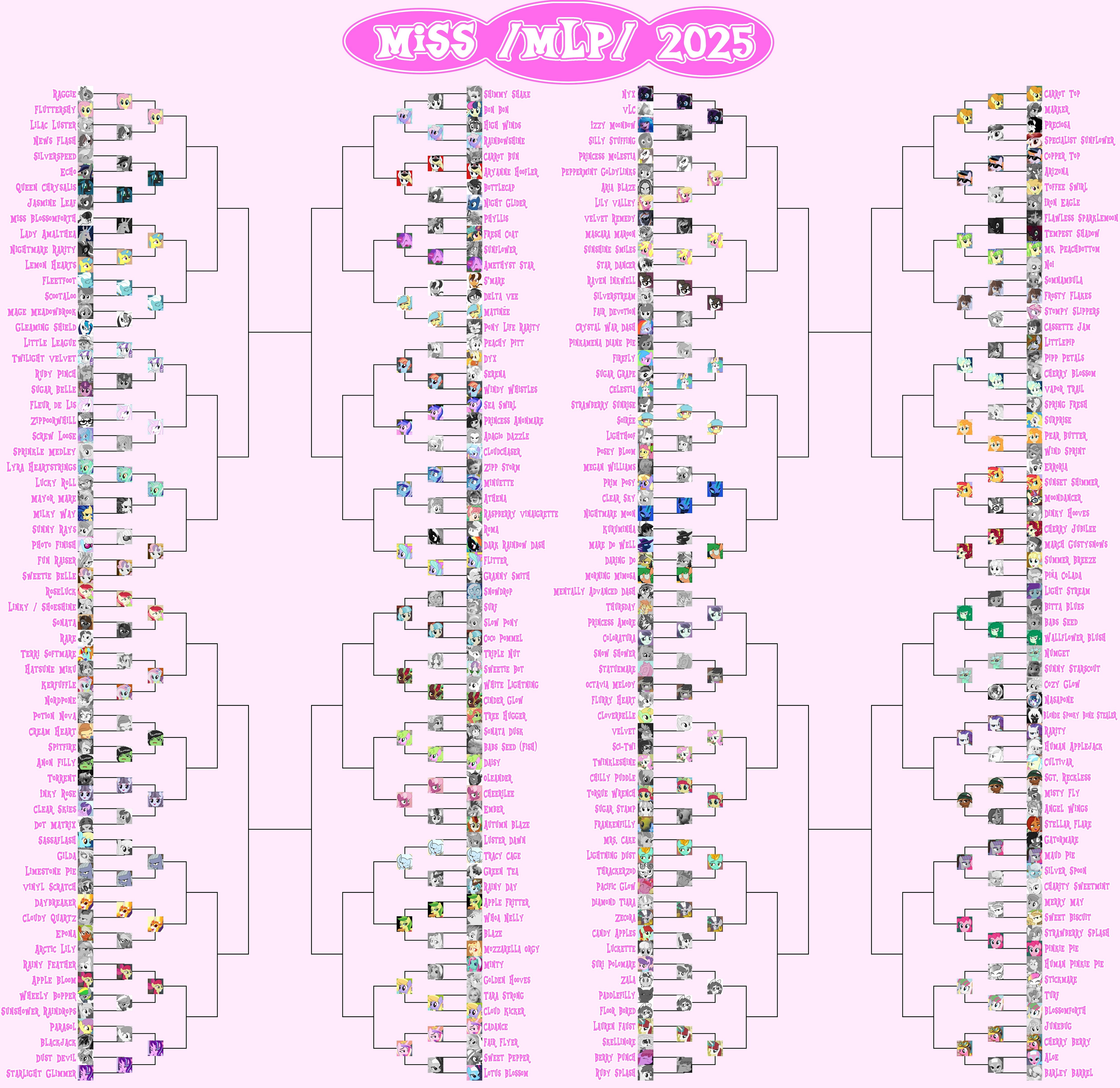 >>4274373631. Pinkie Pie vs. Maud Pie ( 50.7 - 49.3 )10 vs 15 removed, narrows gap but not enough32. Cherry Berry vs. Blossomforth ( 64.4 - 35.6 )12 vs 13 removed, narrows gap but not enough21 vs 4 removed, would have widened gap>Mini-Brackets (Only including those that'd narrow/change the result)>Best OCTracy Cage vs. Blonde Spooky Bone Stealer ( 58.8 - 41.2 )10 vs 15 removed, narrows gap but not enoughNumget vs. Aryanne Hoofler ( 54.7 - 45.3 )10 vs 14 removed, narrows gap but not enoughCream Heart vs. Soirée ( 62.9 - 37.1 )7 vs 18 removed, narrows gap but not enough>Best PrincessFlurry Heart vs. Pipp Petals ( 64.5 - 35.5 )8 vs 17 removed, narrows gap but not enough>Best ManeNightmare Moon vs. Kerfuffle ( 66.1 - 33.9 )9 vs 16 removed, narrows gap but not enough>Best BitchFlutterbitch vs. Suri Polomare ( 56.7 - 43.3 )10 vs 15 removed, narrows gap but not enough>The biggest win of the main round goes to Princess Cadance, who took a solid 65.4% victory margin over Cloud Kicker 244 to 129>In the Mini-Brackets an even bigger win was had courtesy of Nightmare Moon in the Best Princess bracket, beating Princess of Hypnosis Shining Armor at 76.7% with 257 to 78.>The closet match of the round overall goes to Pear Butter, who manged to squeak by Vapor Trail at a narrow margin of 50.4% and only 3 extra votes.>In the Mini-Brackets, the closest match was Milky Way's 52.1% victory over Sunset Shimmer in the Best Mane bracket, coming out ahead by only 14 votes.>The lowest Seed remaining in Miss /mlp/ 2025 continues to be Tracy Cage at Seed 154! Along with Seed 81 Wallflower Blush, Seed 76 Lily Valley, Seed 75 Zecora, and Seed 70 Cherry Berry, these five are the only contestants remaining under Seed 64.>The highest Seed to fall out this round was Apple Bloom, Seed 3, who was taken out by Seed 36 Starlight Glimmer.>The lowest Seed to beat a higher placed Seed this round was Tracy Cage, who managed to overcome Seed 88 Apple Fritter.