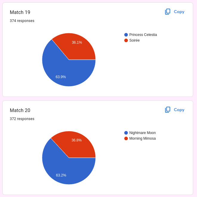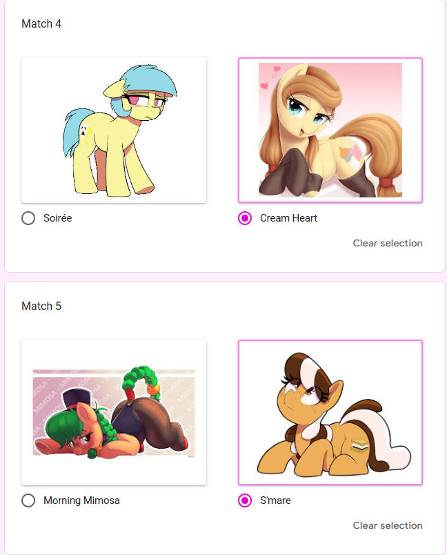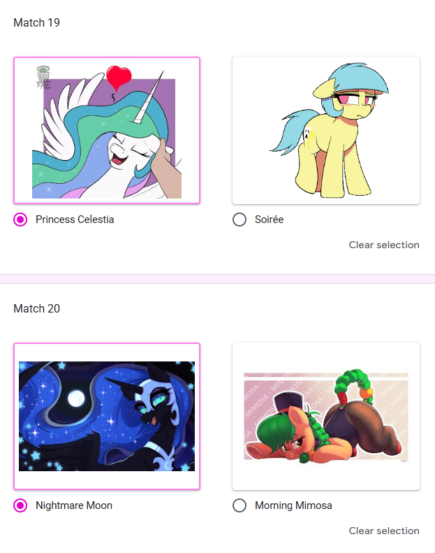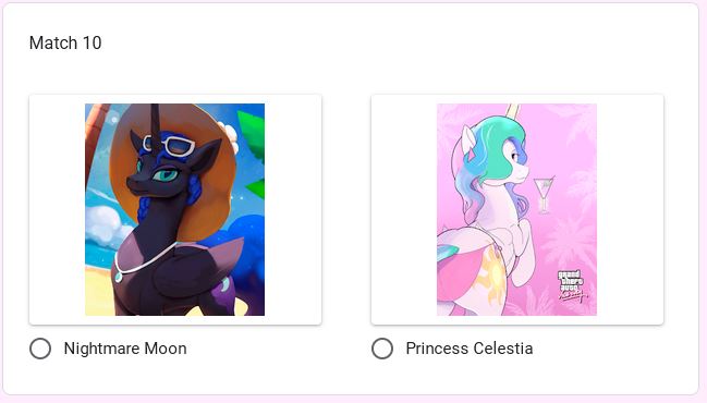 >>42738507 Previous threadWelcome to the continuation of the 2025 Princess /mlp/ pageant, where your favorite ladies from across all aspects of the franchise be it canon, fandom, or memery are judged and selected for who is most deserving of being crowned board royalty.Only eight and a half hours remain in the Round of 64! Only thirty-two of our contestants will have the chance to push on towards the ultimate goal, and they need (You) to help them make it. Vote below to see them on their way toward the winner's circle! And even if your girl of choice is already out, many of them are still competing in the Mini-Brackets as well.Round of 64: https://forms.gle/6JrUngQvHtCJafZw8https://forms.gle/6JrUngQvHtCJafZw8https://forms.gle/6JrUngQvHtCJafZw8Time until Round of 64 completes: https://itsalmo.st/time-for-round-of-64-to-end-jsnsCurrent Mini-Bracket Standings: https://docs.google.com/spreadsheets/d/1-VTJEmaxGbp_mF73h5IylJWp0EFERMgN5hzgGMKCNlo/Results of Qualifiers: https://forms.gle/q8Jp4CaKBFxRsffHAResults of Round of 256: https://forms.gle/yZ5cqcRjWpNbnX7j8Results of Round of 128: https://forms.gle/K2n1NxQWL23VmRqi8And of course, feel free to root/shitpost for any of your favorite girls below!