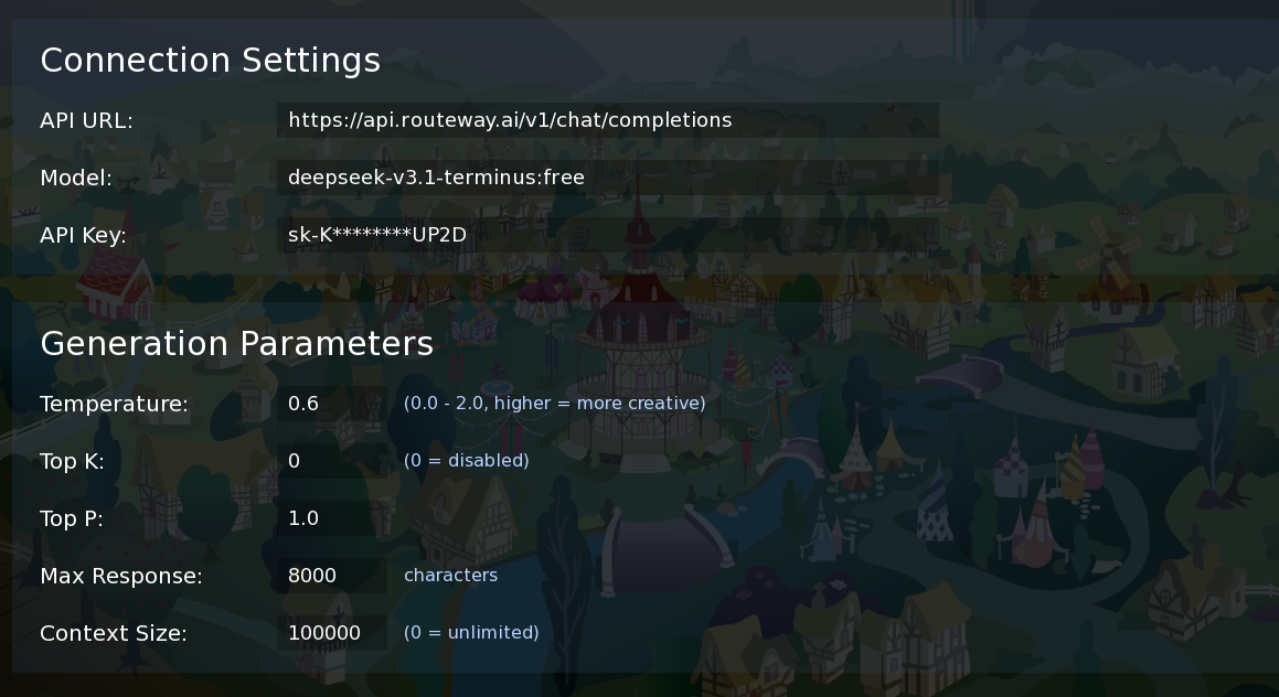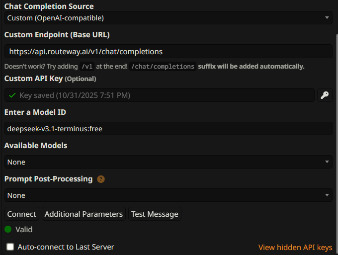 >>42747475Go here and create an API key:https://routeway.ai/Configure like this:URL: https://api.routeway.ai/v1/chat/completionsModel: deepseek-v3.1-terminus:freeI think Temp 0.6 is good for DeepSeek, but I'm not an expert, so someone can correct me.You may still prefer Gemini honestly, but it might change things a bit so you can switch between them.Keep your Gemini config somewhere and save it before trying DeepSeek to see if you like it or not.
