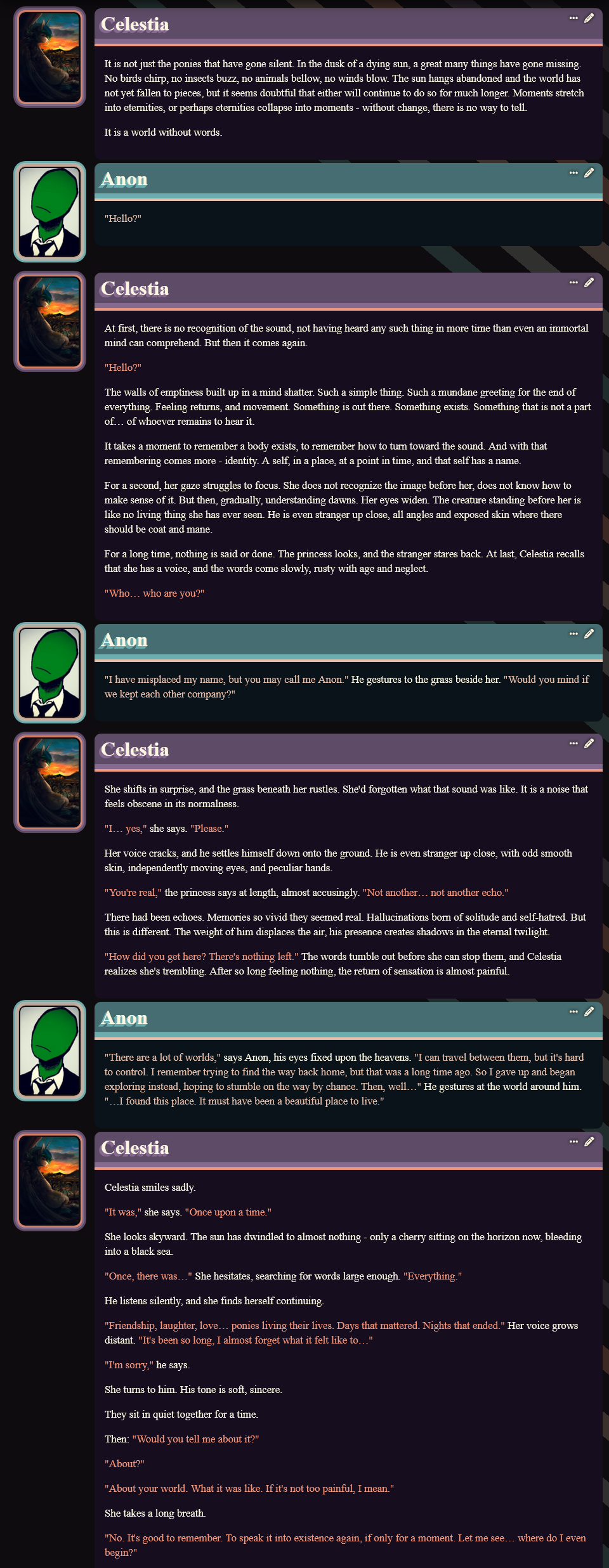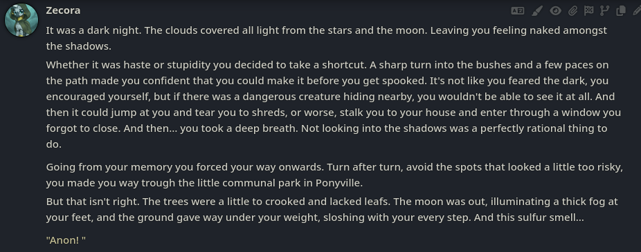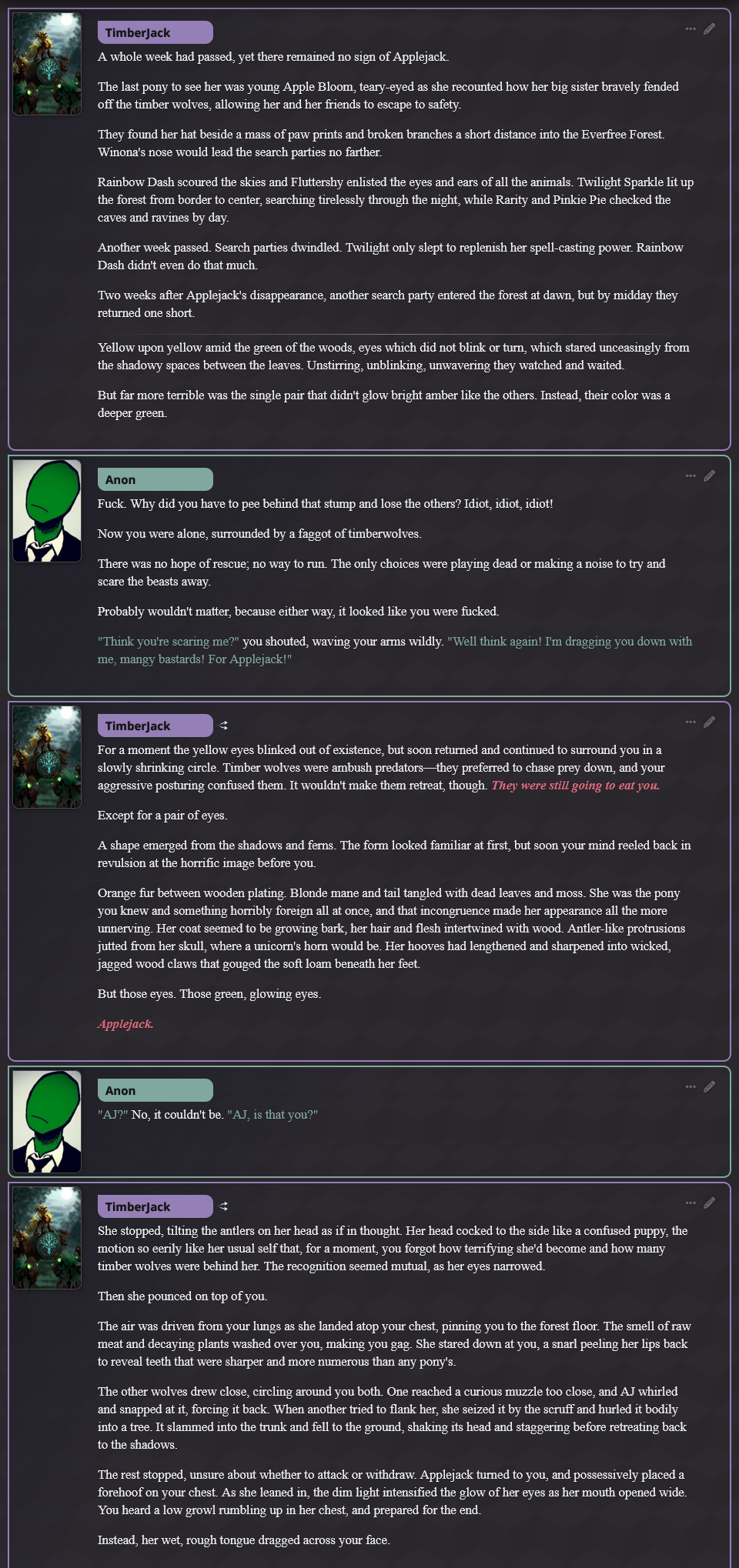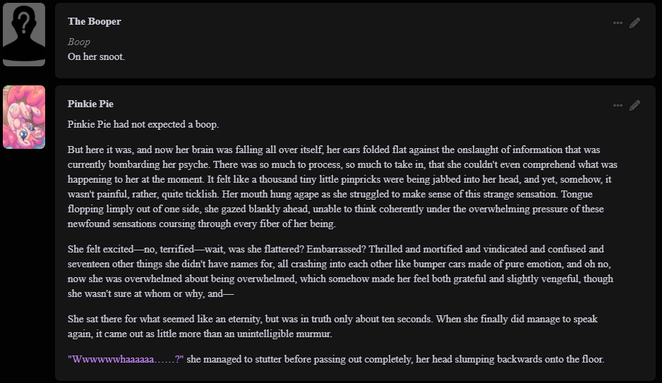 >>42751245I'm currently playing the vampire Rarity one, I'll post logs if I get really kino ones.I also have an idea of putting all the new monsters into a group chat together, might do that later.