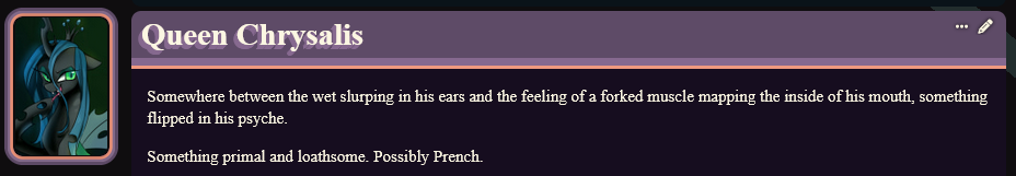 >>42758434I'm still having fun with my zecora. Great horror atmosphere and sometimes it writes an interesting story in the story.I haven't tried all the other cards, but Rosey is the endearing to me so far. A bit too much fixated on the eggplant for me, but that's probably a me issue.