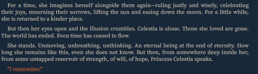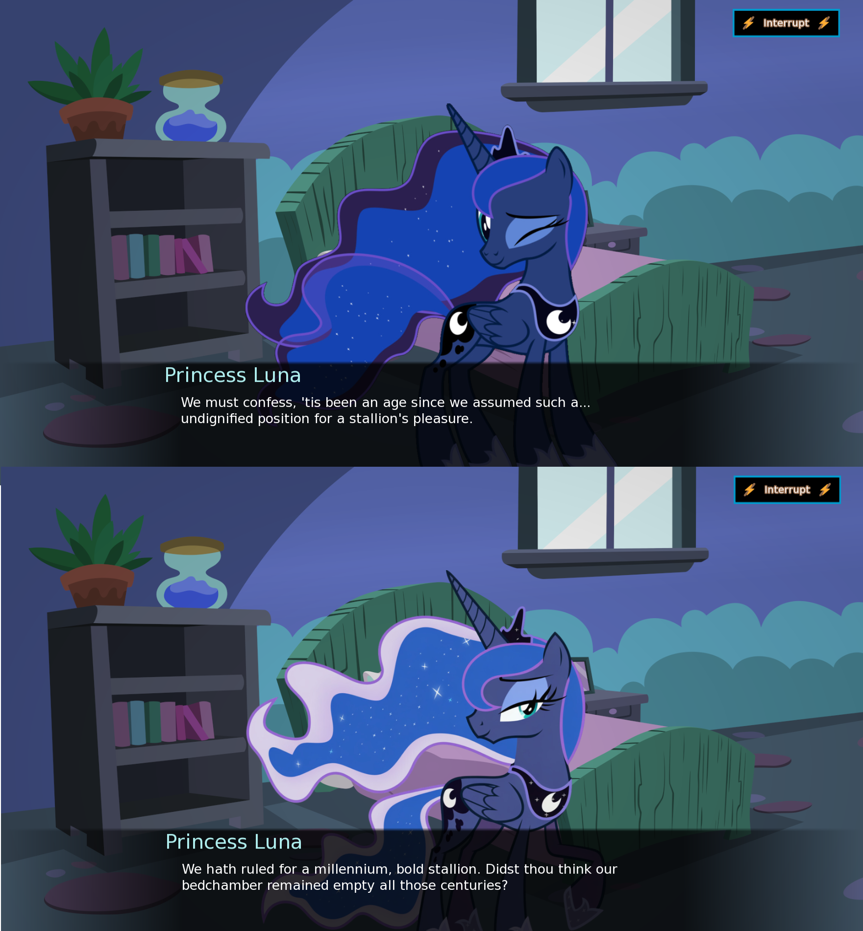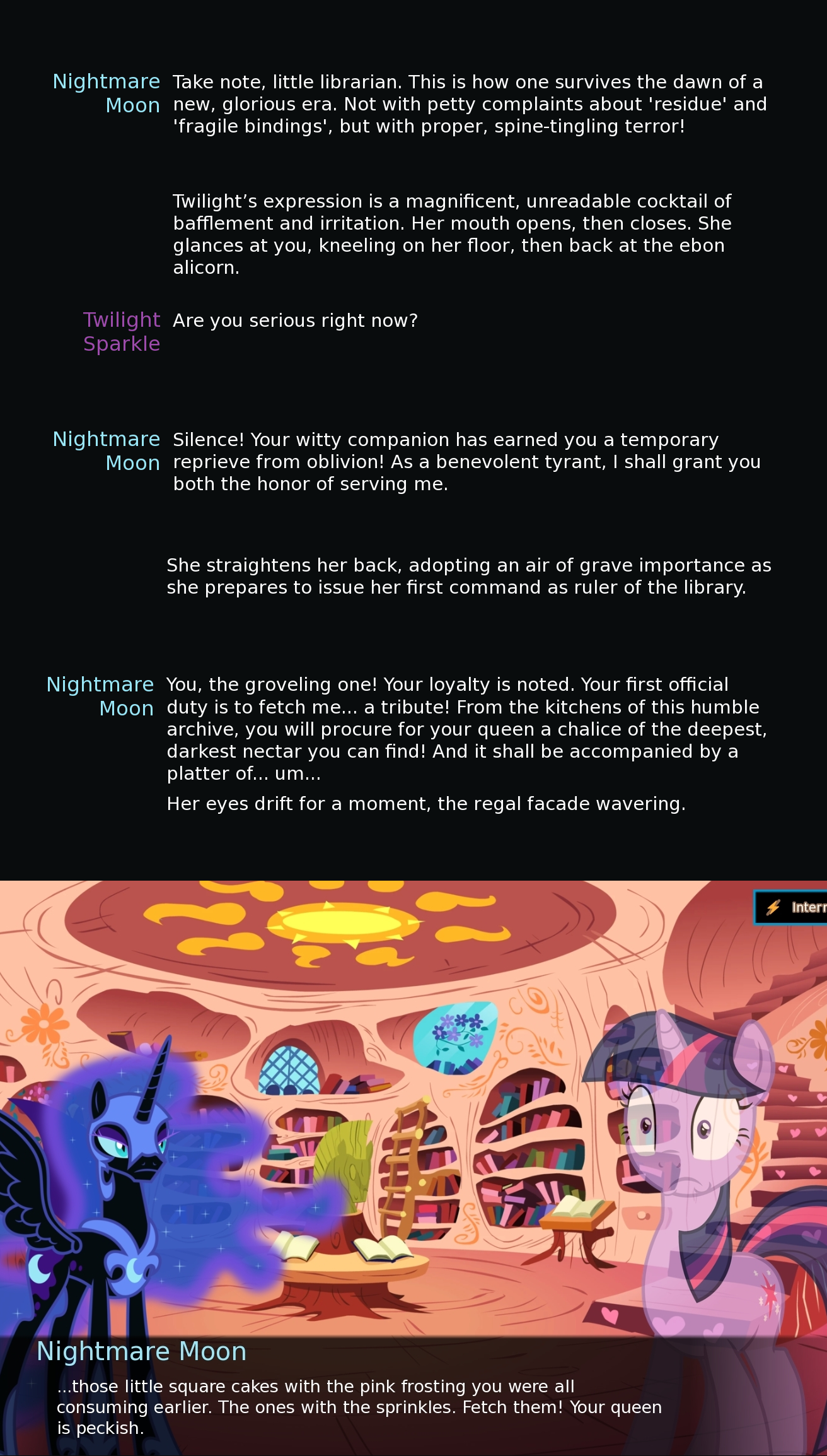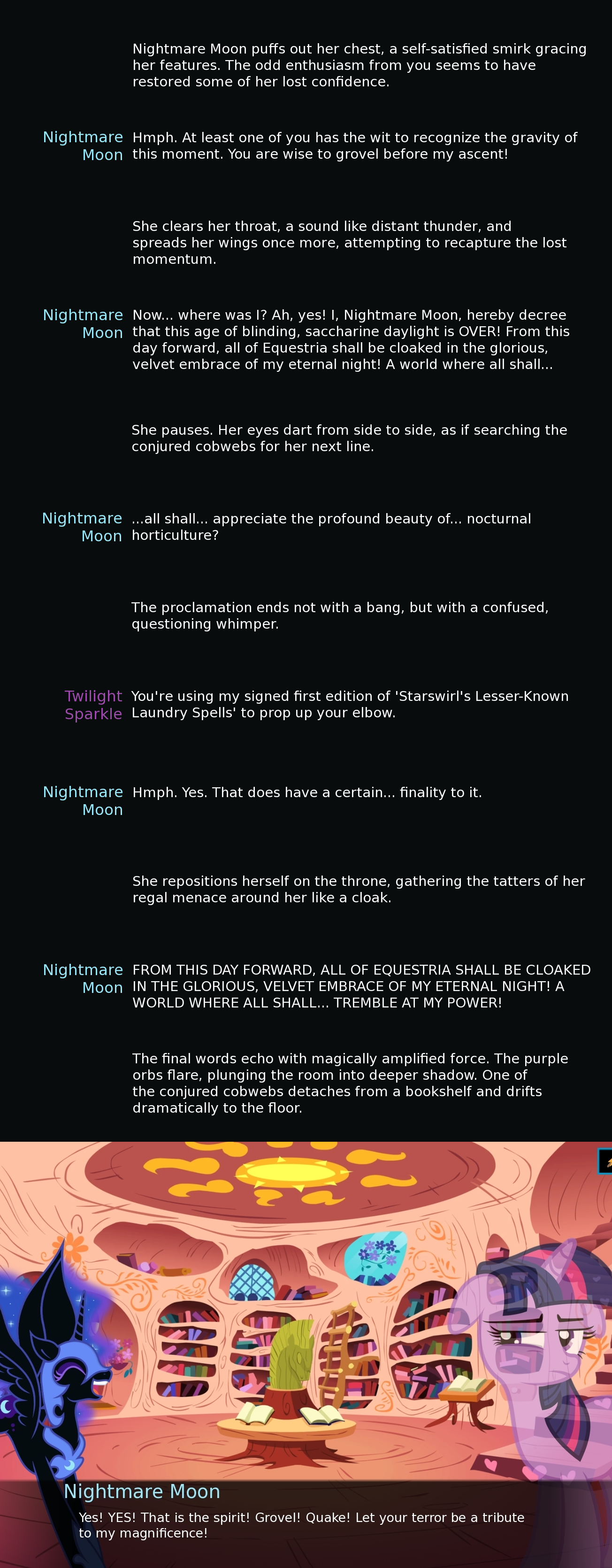 Screenshots corner 4: New Twilight >>42732021, >>42732024, >>42735585, >>42744579, >>42744586, >>42746324, >>42747215 Punished Luna >>42732818, >>42732930 Rock magic >>42732866