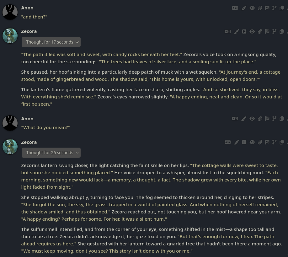 >>42750338It's a bit of a Frankenstein's monster.I was switching between models and presets to see which one could give me the best ending. Opus 3 with a light prefill:https://files.catbox.moe/kdzxpk.txt gave me this output up until the "She loved it" part. The ending was a bit weak, but I found the beginning really well done, and I loved the toothbrush part. So I copied that section, replaced my prefill with it so other models can continue from there.Then I switched to 4.5, and it picked up the story nicely, bringing back the plot about her looking into alternative versions of herself from the beginning, which I liked. However, the last few lines didn't stand out much.So I copied that part into the prefill again, switched back to Opus 3, and it finally produced the "love" part at the very end.So you could say it's 75% Opus 3, 25% Sonnet 4.5Most of the earlier chat was done with Sonnet 4.5 and the preset posted here: >>42729324. Sorry if this isn't a straightforward answer, I've been experimenting a lot during chats.One thing I'm testing right now is a prefill with just {{lastMessage}} inside. This way, models like Claude 4.5 seem to continue more naturally from your last response, rather than dividing it between user and model; especially if your last input had some thought put into it.