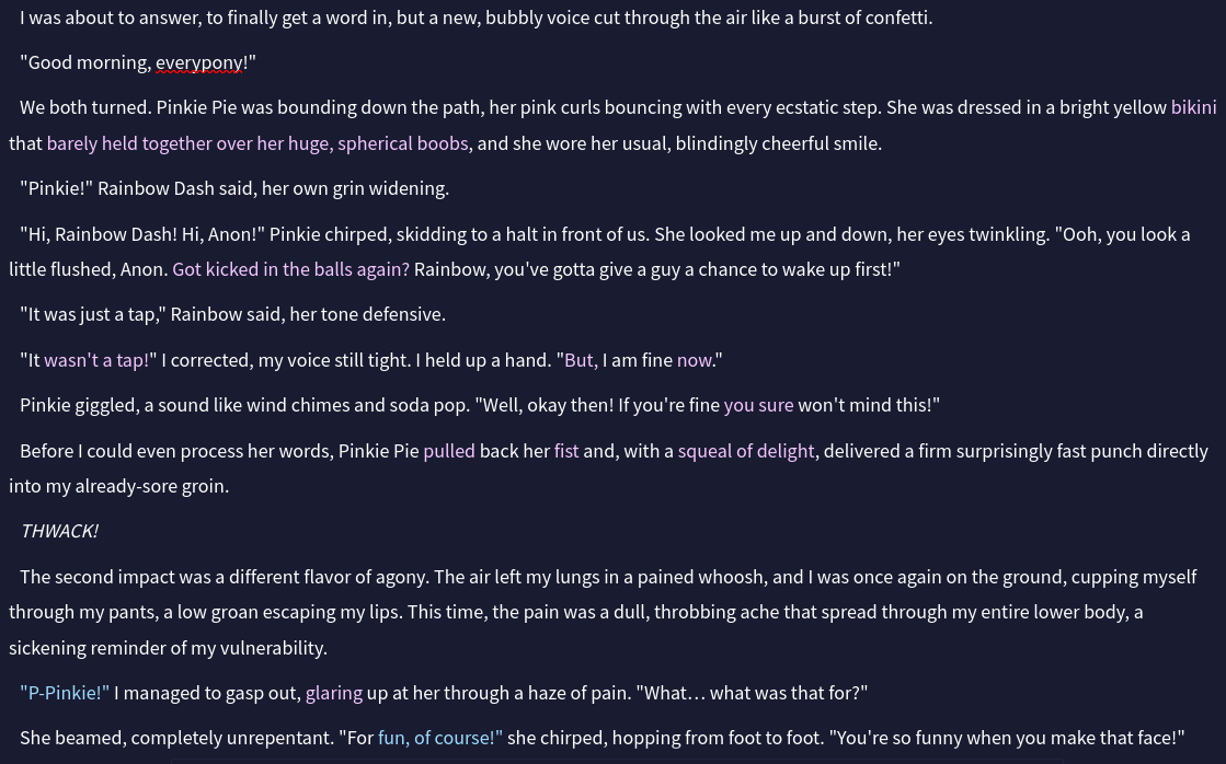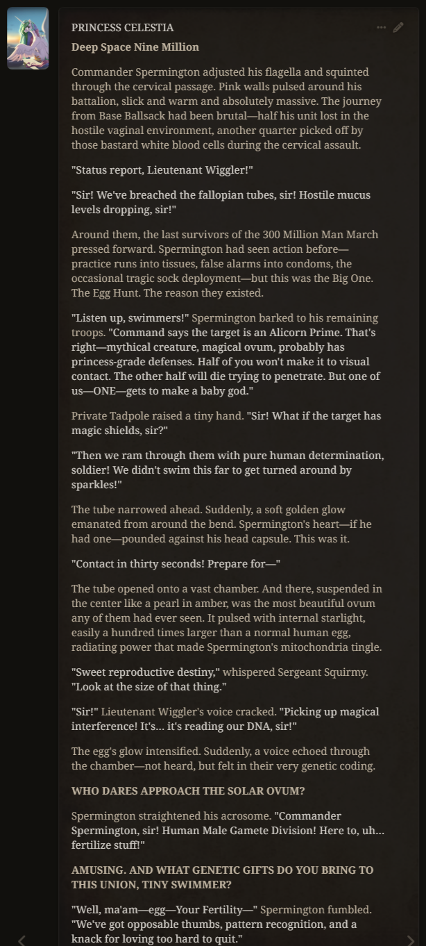>>42747867Casually horny TwiUses (you) as escapism from her princess duties to be a neet /mlp/ user hellbent on proving superiority of pony pussy over humans and anthro. Only ever tested her on Sonnet 4.5.Should I upload her to anywhere else or keep it thread exclusive?Post feedback and logs.https://u.pone.rs/uvjygixg.png