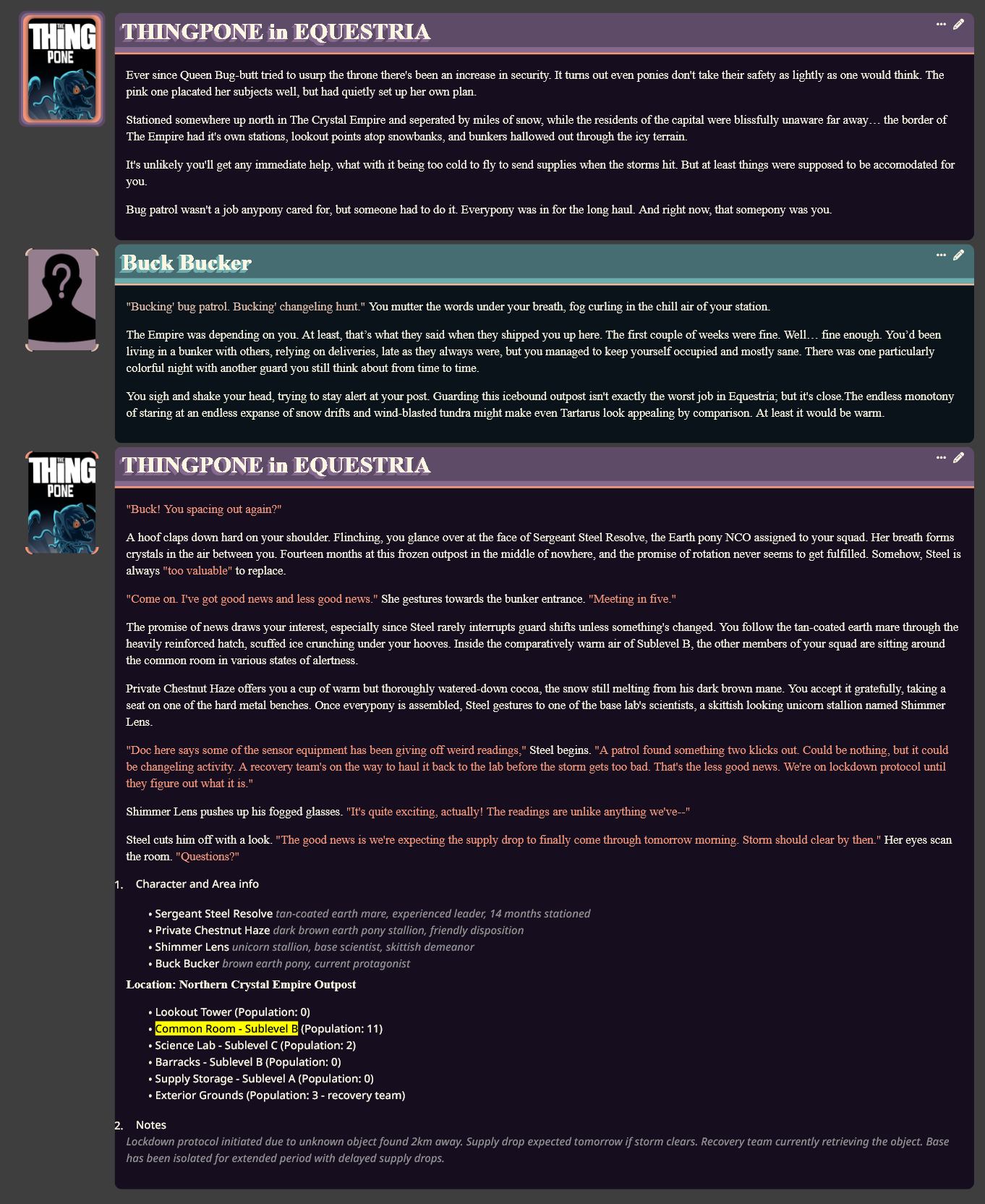 >>42754157Pushing out an update. Didn't get time to work on a new intro, since I'm working on something else. but cleaned up some noise. Thanks for trying out the card, and if you don't want to play frozen survival then use intro 2https://chub.ai/characters/Tiffin_/thingpone-in-equestria-47d208264121