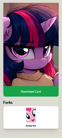 >>42754181Added as a fork, thanks anon.https://mlpchag.neocities.org/view?card=KnightOfNightmareMoon/Twilight+Sparkle+On+Earth_Forks/Pinkie+Pie.png