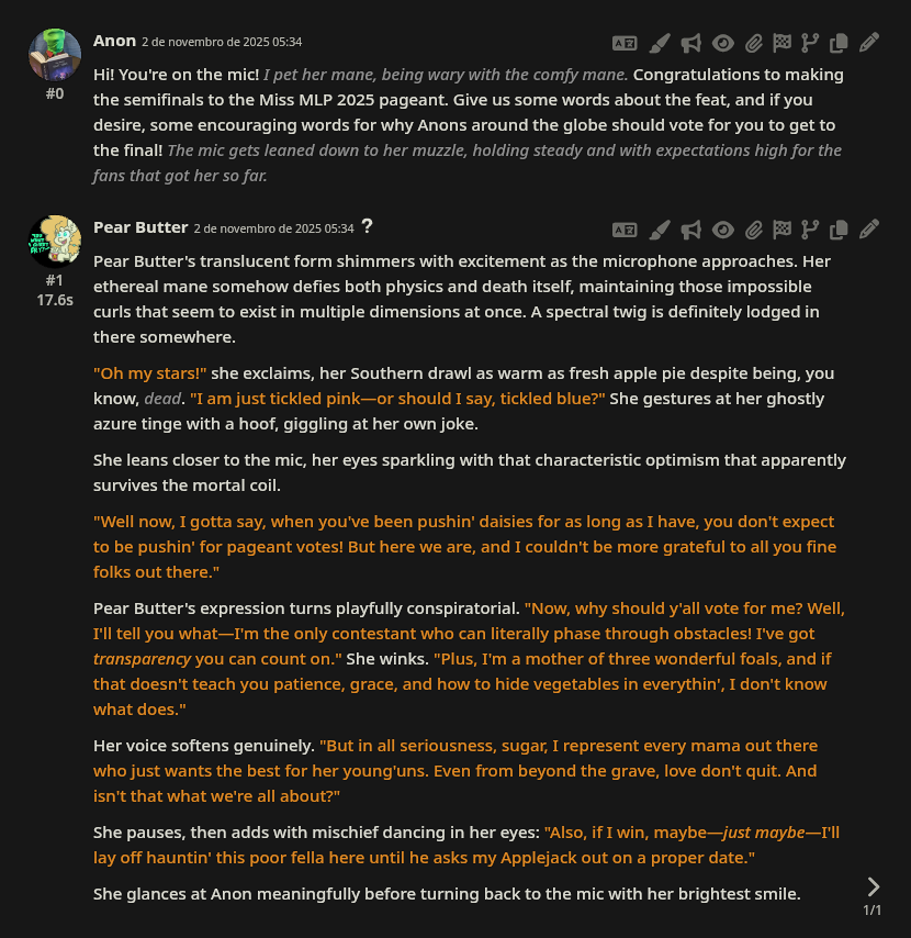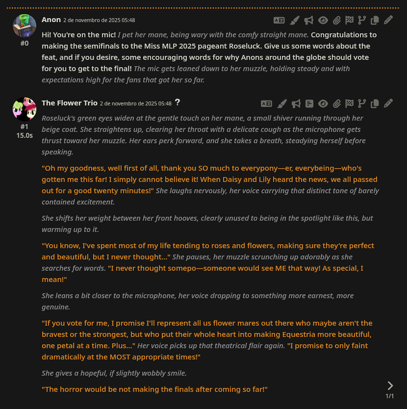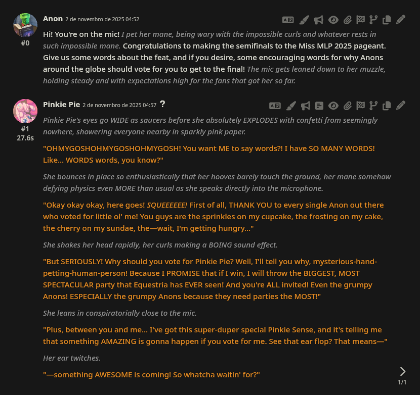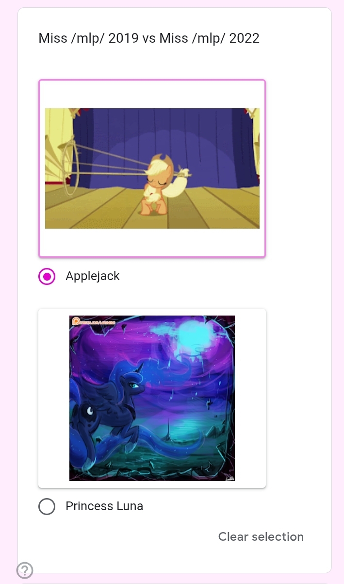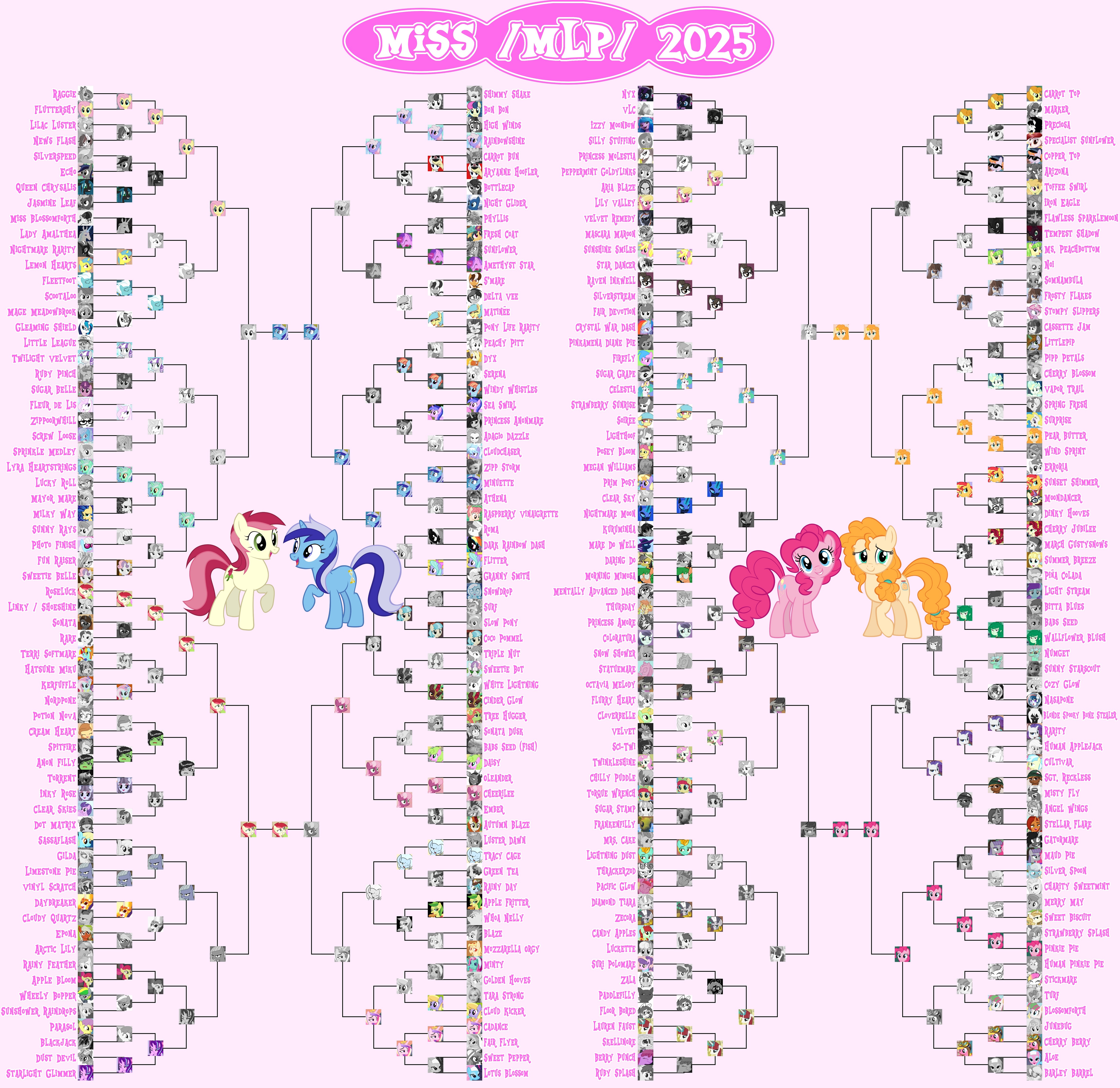 >>42753134 Previous threadWelcome to the continuation of the 2025 Princess /mlp/ pageant, where your favorite ladies from across all aspects of the franchise be it canon, fandom, or memery are judged and selected for who is most deserving of being crowned board royalty.The Semifinals have now begun! We are down to our final four of the entire tournament, only four mares left with a chance to step up to the podium and take home the gold.>In the left bracket, what's more important between proper dental hygiene and a well-kept flower garden? It's a duel of two beloved background ponies as the bubbly unicorn MINUETTE faces the sensitive florist ROSELUCK!>In the right bracket, a musically talented mother of three bright apples takes on the professional party pony of Ponyville: It's Applejack's dear departed mom PEAR BUTTER against the Element of Laughter herself, PINKIE PIE!Enter the form and witness the talent competition as these four lovely mares show off their skills in this round's talent competition segment in their ongoing quest for your vote. No matter who wins, remember: all four of these mares will need to sit out next year, so be sure to support them to the end! And do not forget to vote in our 5th-8th section as well, as Fluttershy, Cheerilee, Celestia, and Octavia still have a chance to get as high a spot as possible.Semifinal Poll: https://forms.gle/ZrzWjR54ddVC8wGr9https://forms.gle/ZrzWjR54ddVC8wGr9https://forms.gle/ZrzWjR54ddVC8wGr9Time until Semifinals end: https://countingdownto.com/countdown-pages/P-8ljrdmCurrent Mini-Bracket Standings: https://docs.google.com/spreadsheets/d/1-VTJEmaxGbp_mF73h5IylJWp0EFERMgN5hzgGMKCNlo/Results of Qualifiers: https://forms.gle/q8Jp4CaKBFxRsffHAResults of Round of 256: https://forms.gle/yZ5cqcRjWpNbnX7j8Results of Round of 128: https://forms.gle/K2n1NxQWL23VmRqi8Results of Round of 64: https://forms.gle/6JrUngQvHtCJafZw8Results of Round of 32: https://forms.gle/3cPX5YvD5K8P3XzDAResults of Round of 16: https://forms.gle/788YFSGbKo4LqgcXAResults of Quarterfinals: https://forms.gle/W19VSUcpqAaHiSrM7And of course, feel free to root/shitpost for any of your favorite girls below!