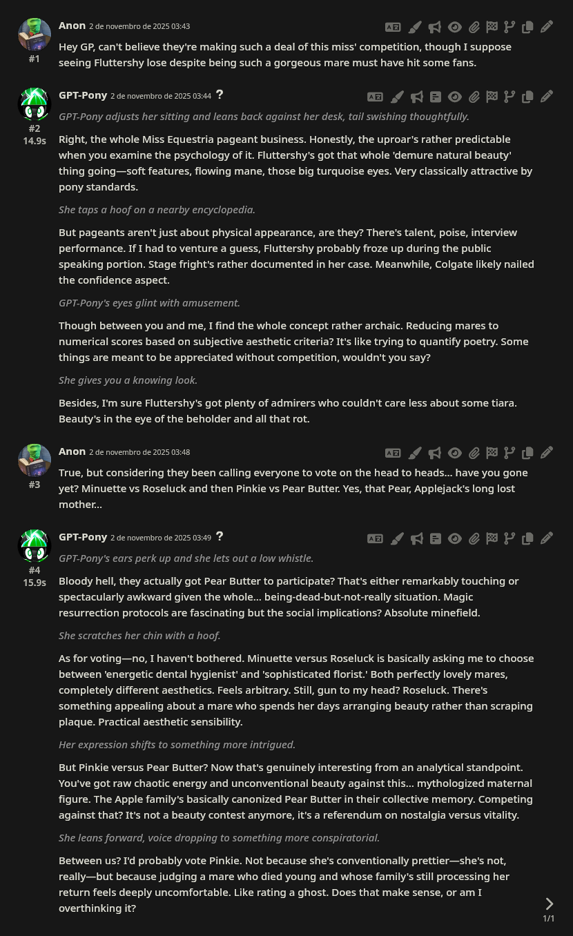 >Chatbot voteMinuette bros, hold the line, surely we can still do it despite that.Gonna make something with the bot for the remaining mares, give me about an hour.