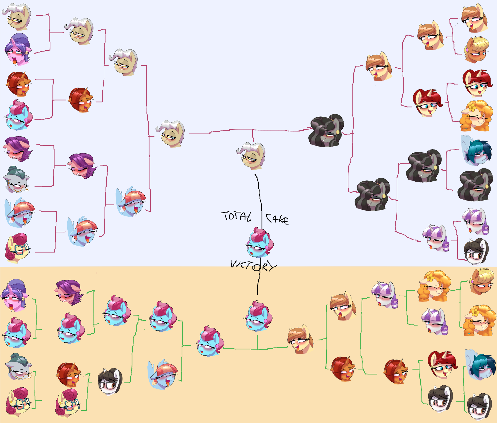 >>42757188Make it even MORE random:There aren't any brackets where ponies go into matches in sequence, but rather every single round is re-randomized so no one knows who's going up against whoRandomize every single round and strategic voting dies