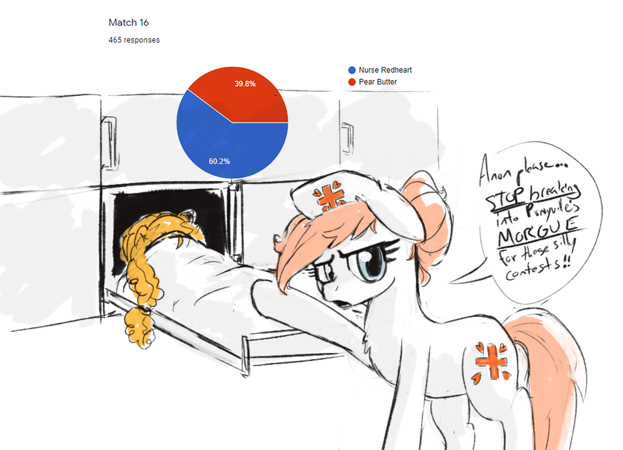 Here I was expecting a good matchup against Cheerilee, but I see now that I've made the rookie mistake of voting for the ponies I liked while my wife was still in the running. I will remember this.