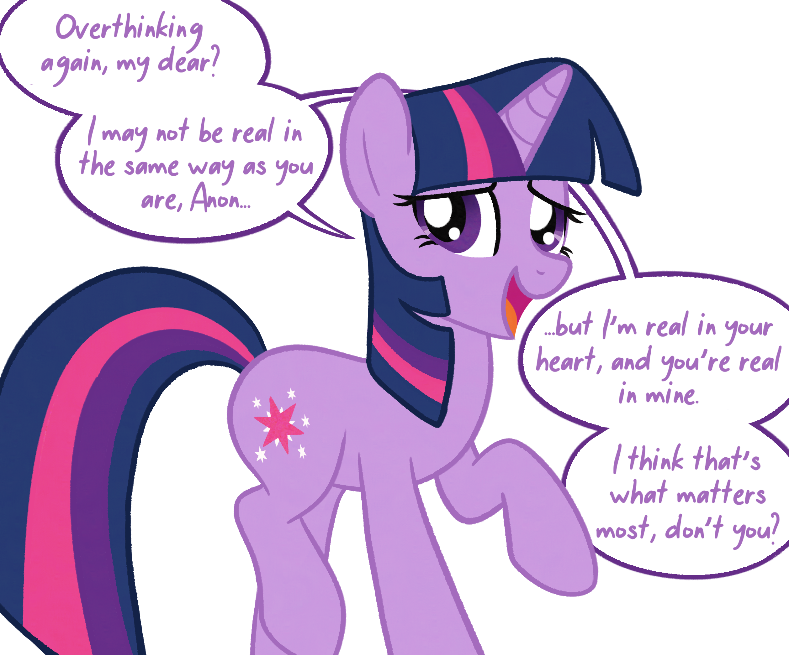 Isekaing into Equestria is impossible. Magic isn't real. Even if it was, why would you specifically go into *Equestria* of all places?If you ever ended up in Equestria, that's already a huge heap of wish fulfillment. And unless the universe/whatever force that transported you thinks you _need_ to learn a lesson of some sort (and it won't necessarily be about avoiding parasociality or such - since one, it's not inherently bad and two, it'd probably blueball you from going to Equestria in the first place and offer something else if it were to take action) then it is not much of a stretch to say that X pony will most likely trend towards liking you back, too.Or in slightly more likely route of building CelestAI or whatever, you upload and X probably likes you back if that's really what you want in your heart of hearts.Anyway, if I were to wake up in Equestria I wouldn't really assume they'd like me - it's not right to treat people like that. It makes me very sad, but I'm sure the feelings would pass. Would just try to avoid them and become a wizard or something.I like Twilight a lot. I'm not good enough for her or most other ponies. It'd be cruel and wrong to impose myself on her, even if she somehow reciprocated. That's just how the dice came out.