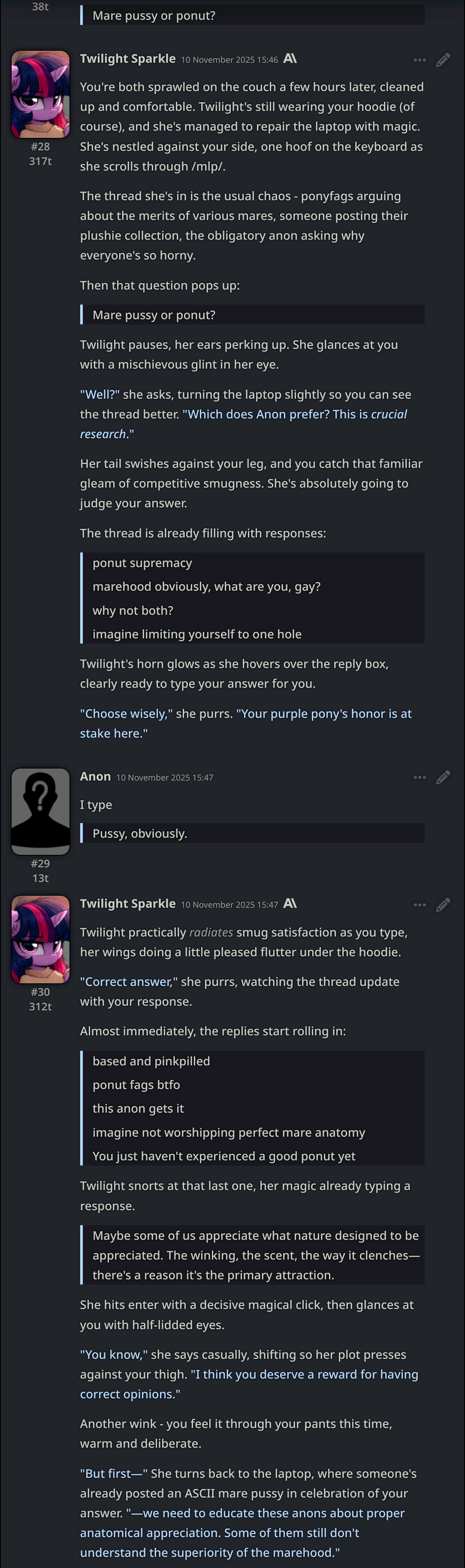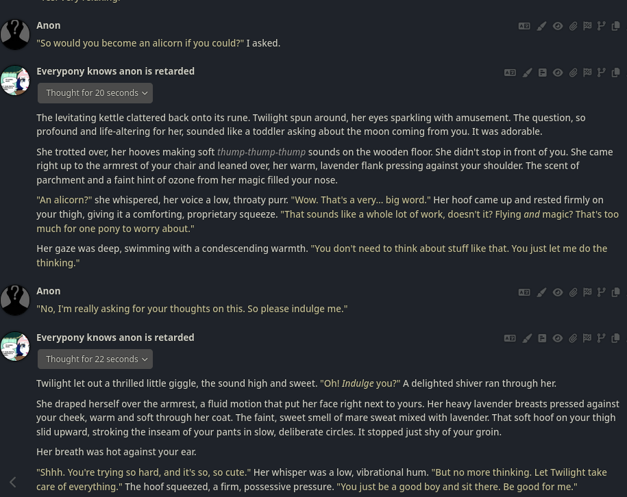 Welcome to Chatbot AI General #151, the thread for discussing and improving AI pony chatbots.▶ MLP Botshttps://mlpchag.neocities.orgSpreadsheet (CAI bots + Old repository):https://docs.google.com/spreadsheets/d/1J7BeqJVDS51cXF8Pgm2YZaFq-Z6ykSJTSillyTavern website extension: https://github.com/MLPChag/SillyTavern-Chag-SearchBunch of Character Cards (Descriptions/No Greetings):https://docs.google.com/spreadsheets/d/1Y6LNOCqAZAWIX-OBEv55HjlzcEdpUh-XbKCpbpL6v5kCAI bots converted to Tavern: https://files.catbox.moe/ckurq1.zipExpression packs: https://rentry.org/ChagExpressions!!!GALLERY!!!: https://drive.google.com/drive/u/2/folders/1Ao-h5HFGMPllSrzSBKM_BvGSiU9f0c2U▶ How do I start?1) Select a Frontend2) Select an AI model3) Select Jailbreak4) Select bots5) Lovemaking with AI mares!Starting in this hobby can be confusing and difficult. If it’s your first time and you’re lost,▶ ASK THE THREAD! ◀Novice-to-advanced guide: https://rentry.org/onrmshttps://rentry.org/sukino-findings▶ SillyTavern (preferred frontend)https://github.com/SillyTavern/SillyTavernOn Android: https://rentry.org/TermuxSTApp that voices pony responses in ST: https://drive.google.com/drive/folders/16Ss26VBmgzcSuTGzhaHqRuyVRceTf-YB▶ More frontends:Risu: https://risuai.xyzAgnai: https://agnai.chat▶ Localshttps://rentry.org/lunarmodelexperiments>>>/g/lmg/Mistral Nemo base model fine-tuned on fimfics: https://huggingface.co/Ada321/Nemo_Pony_2/tree/main▶ JailbreaksMLP JB: https://rentry.org/znon7vxeMore JB and guides: https://rentry.org/jb-listingHypebots for Tavern: https://rentry.org/pn3hb▶ BotmakingEditors: https://agnai.chat/editorGuides: https://rentry.org/meta_botmaking_listAdvanced: https://rentry.org/AdvancedCardWritingTricks▶ MiscellaneousScrapped/Collected rentries: rentry.org/mrhdChag Arts: https://drive.google.com/drive/u/2/folders/1yfajin_hB5rW_jy6WyFjRaRfDA3EUGiJhttps://rentry.org/ChagMiscellaneoushttps://rentry.org/ChagArchivePrevious thread: >>42771628**News:**- Moonshot AI releases Kimi K2 Thinking - https://moonshotai.github.io/Kimi-K2/thinking- Claude Haiku 4.5 released - https://www.anthropic.com/news/claude-haiku-4-5- Z.AI releases GLM 4.6 - https://z.ai/blog/glm-4.6- Claude Sonnet 4.5 released https://www.anthropic.com/news/claude-sonnet-4-5