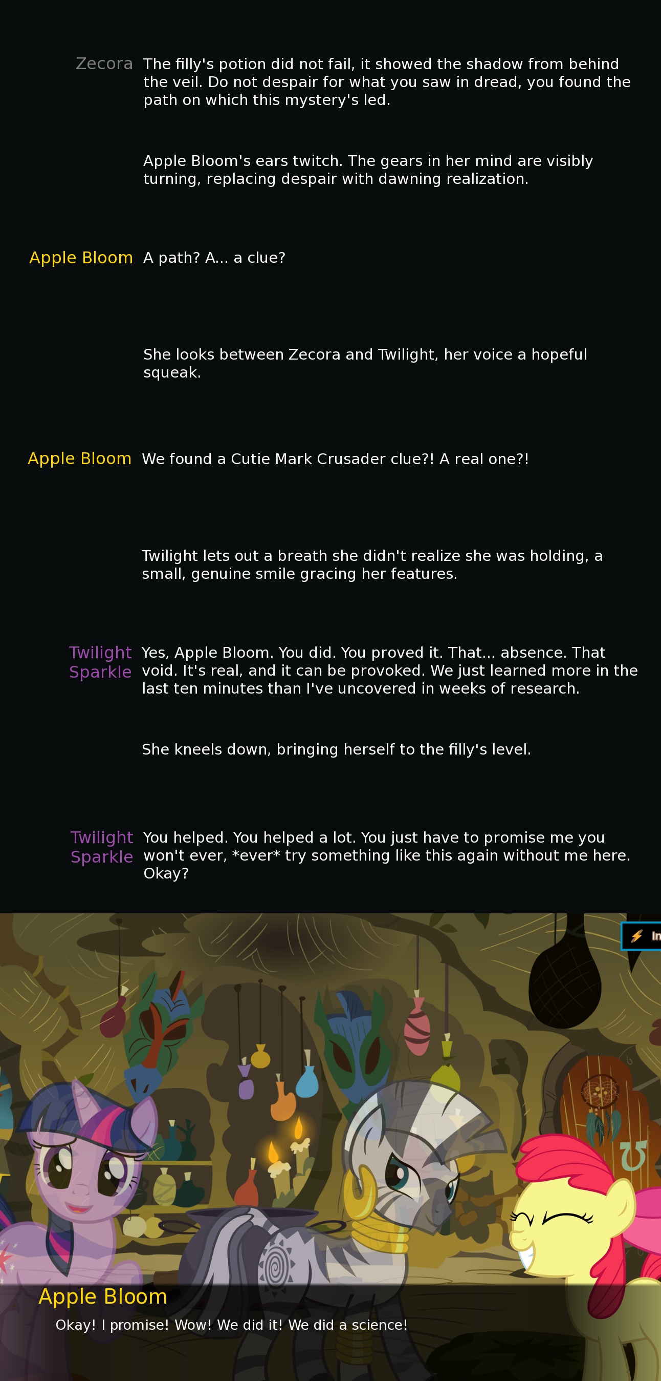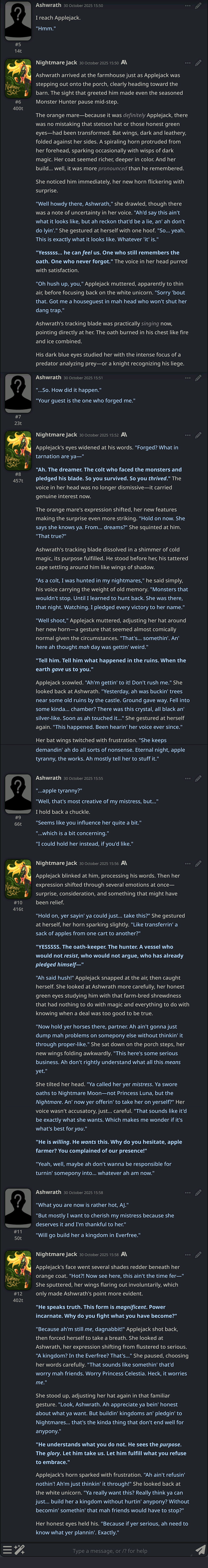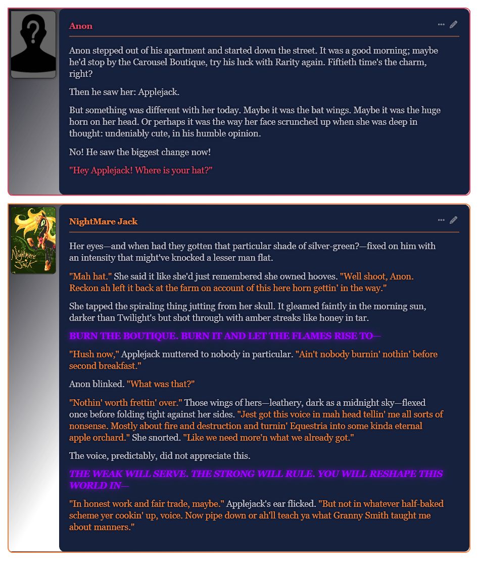 >>42787284Hey, that's my bot.I talked about it in a previous thread, but I wanted to participate in the event, didn't have many ideas, then remembered an old fic where AJ is turned into Nightmare Jack:https://www.fimfiction.net/story/249504/nightmarejackReread it and it's still quite enjoyable; I'd recommend it. Short too.I prefer writing greetings over descriptions, which is why this one is quite brief, but I believe it does the job.The card is simple, with the main gimmick being the style used for the nightmare's voice, which uses Regex to display properly.The greeting has two parts: the Nightmare's defeat and how a small part survives, then the possession of Applejack. I structured it this way because I toyed with making this more of a general nightmare possession card, with the same start but different 'victims': some fun ones like Derpy, Angel Bunny, or a Luna plushie with suspicious holes.I was afraid I wouldn't have enough time, so I went with the single character, but maybe I'll update it or make a fork later.The greeting is in the past tense because I often RP that way, and it wasn't poorly received for the Hag Twilight card I made.>>42787450Thanks for playing with her, anon.