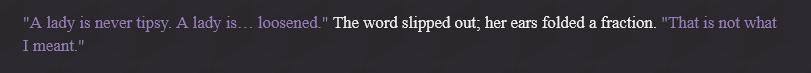 >>42787284Minor note: the <nightmare> tag has incomplete instructions imo. >The des says it's a voice in her head,>it often starts without quotes and messes the formatting up. a little, >while other times it's with quotes like it can be heard. For consistency I'd go with either pick one or the other and specify, or add another rule about it.