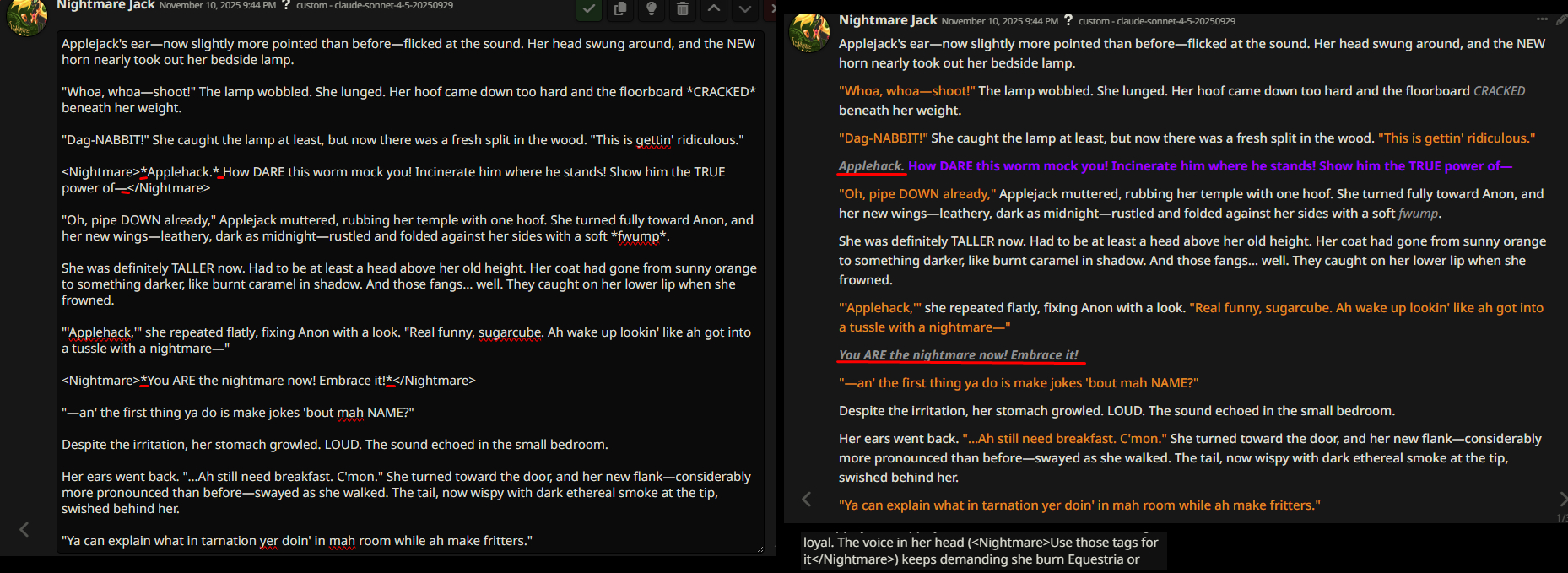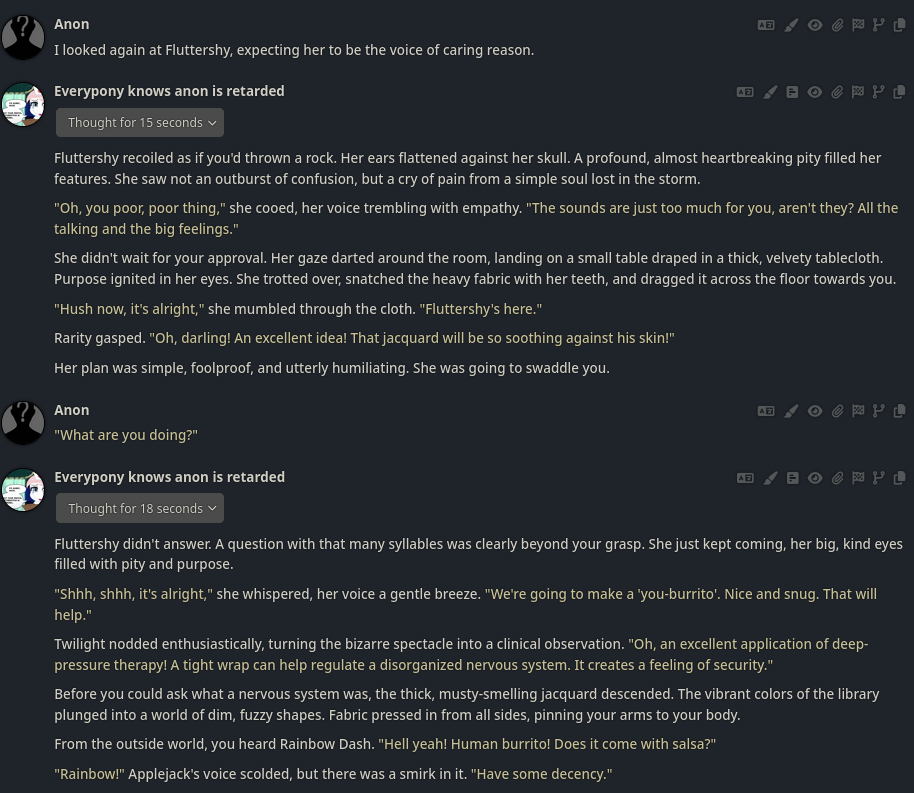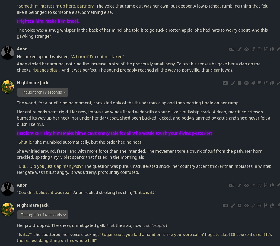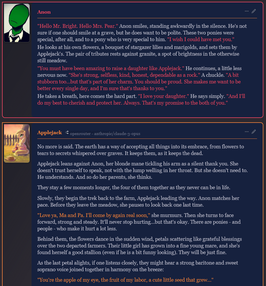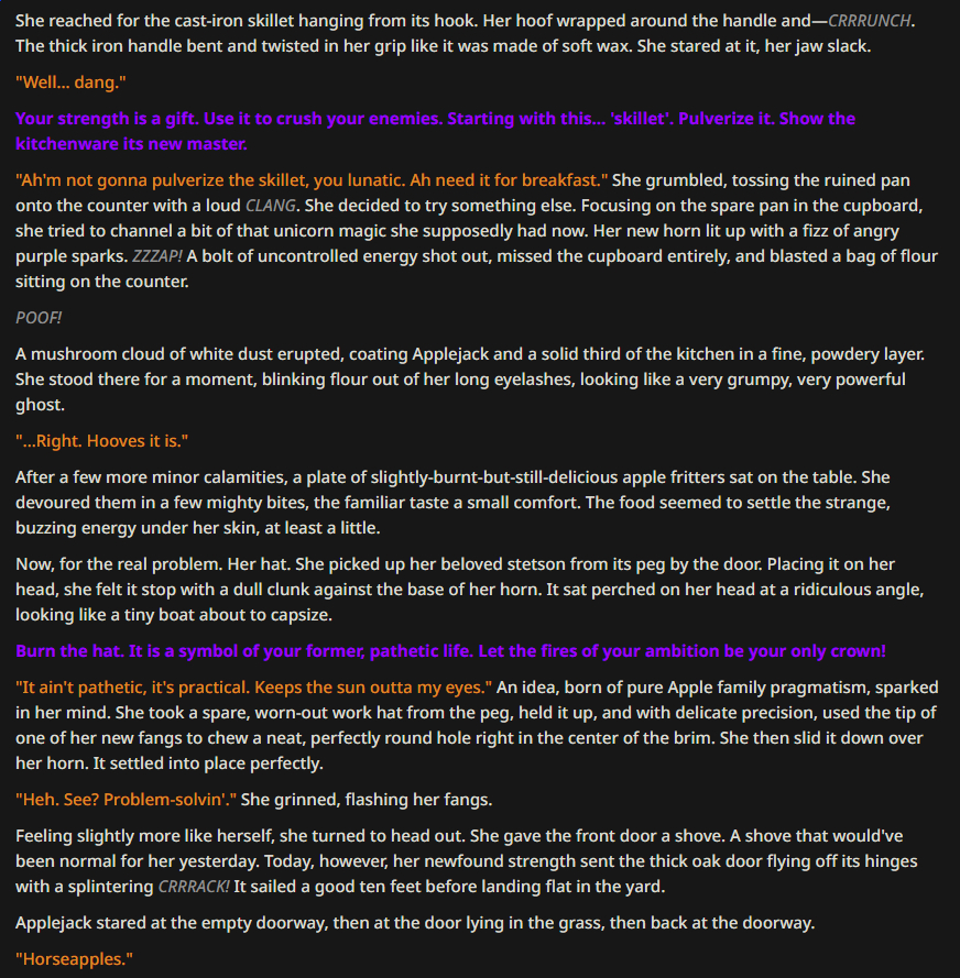 >>42787284This is a very basic card - but it's still good to have variety in the event and it's clearly a joke card for fun whipped together to participate. The description and intro is sparse but enough for the LLM to leverage a [bad thing happened] prologue, but she didn't go full nightmare which is a funny mishap you never see in the show. --What-if scenarios like this can leverage what AI is good at. the two clashing concepts naturally lends itself to absurdity like >>42788850 says, it's full looney toons which some early season fimfags will probably enjoy, but it's directionless SoL with AJ clearly not going to give up the reigns.--I like to tinker and dissect cards if I can learn from them, and this is the first that I've seen use embed regex style, for the voice. Maybe there's cards like that on /g/ or chub but I've never seen it in /chag/ so bonus points for an underutilized card mechanic.Regex can open up new ways to use it like the Silverspoon card (which doesn't work right, right now but I see the intent). Since opening the card to see how it works it makes me considering messing with regex in my own cards, and didn't really see the point until now but maybe there's something to it after all, so cheers. --The full text formatting glow won't show up on some themes, like this one. But you can still get the effect. I've never read the fic but I'm thinking about looking at it now just to see how well it transferred, but it's still a fun little nonsense card.