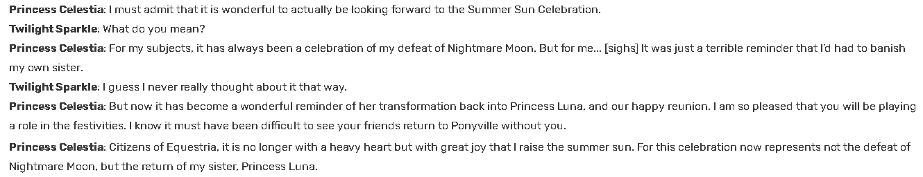 >>42787103>as Season 4 starts with a Summer Sun Celebration that's implied to be the first one Celestia gets to enjoy WITH LunaI don't think that's ever actually stated. Celestia just says that the Summer Sun Celebration "has become" a happy reminder of Luna's return, not that it's the first one they're celebrating together. She's contrasting the past 1000 painful celebrations with all the celebrations since Luna returned, in my opinion.