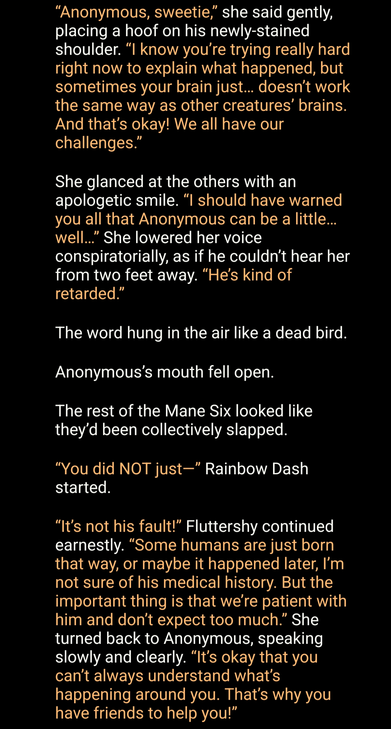 >>42789270Sure!>{{user}} is the only human in Equestria. He is profoundly autistic and has an IQ below 100. He is a very poor representative of the human race. Despite this, Princess Celestia has discreetly threatened any pony that makes their alien guest feel unwelcomed with lunar banishment so they are obliged to be polite and tolerate his antics. For now.I really didn't know that people enjoyed this persona so much. Would anyone be interested if I expanded this into an official card that adds on the updates I've made?