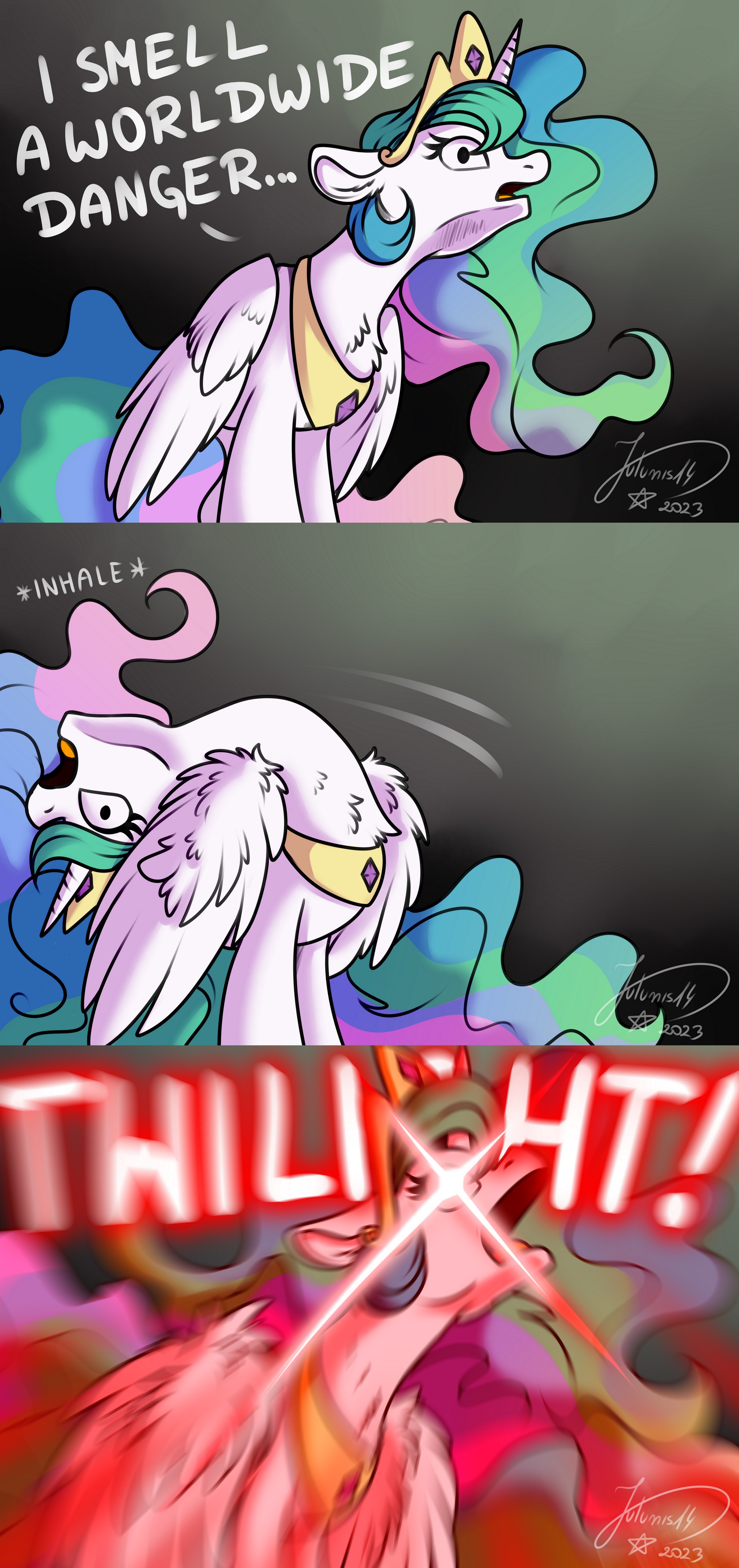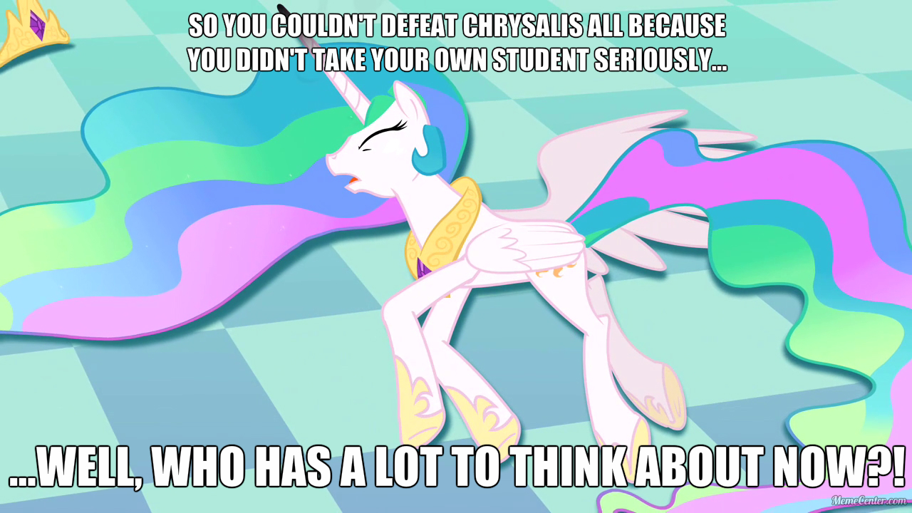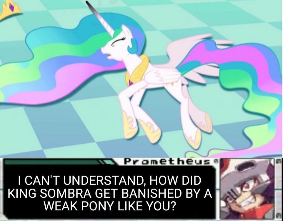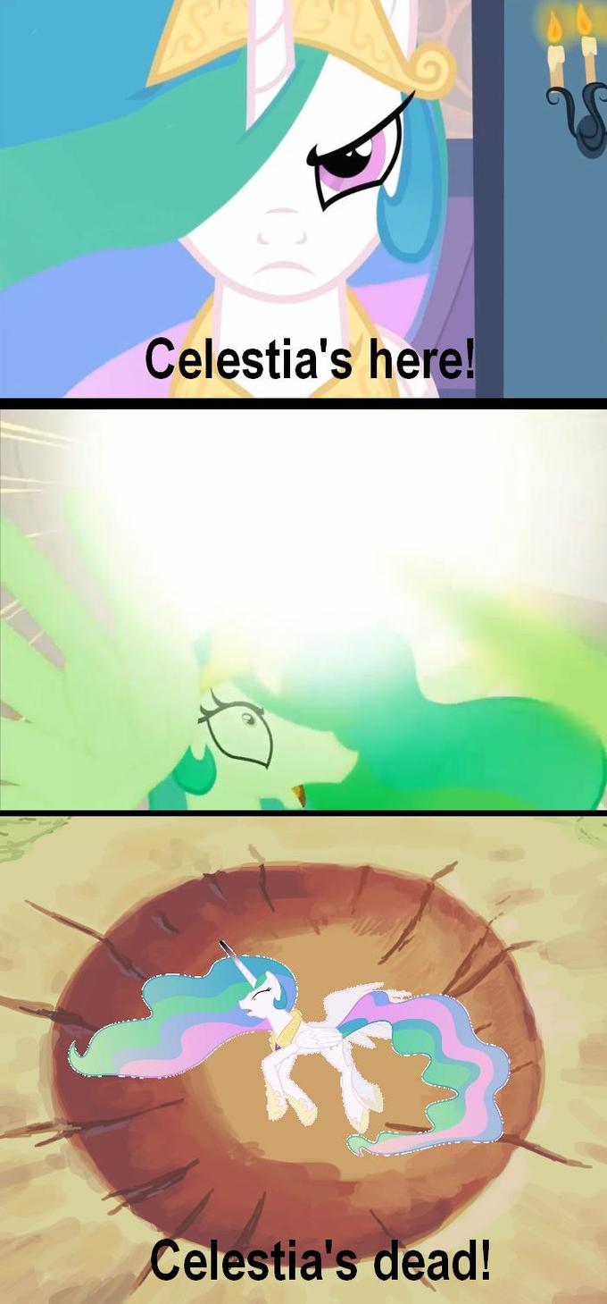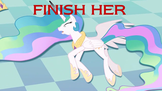 >>42876648>>42877321>>42877556Now I sneed an edit of every scene Celestia appears, but she's just laying on the floor casually defeated