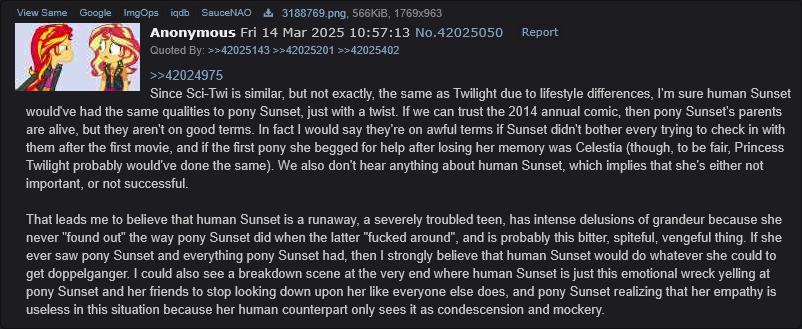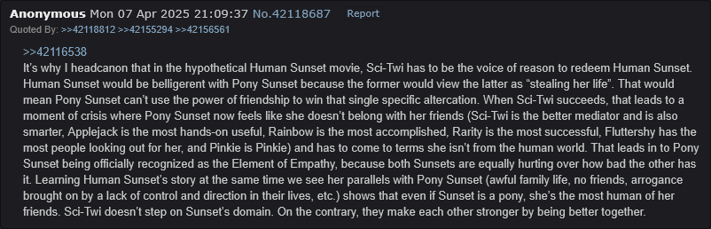 >>42898267>>42898269>>42898245Interesting that anons across time already thought about it a lot, I didn't plan anything to do with the elements, just a lesson about how different sunset's life would be if EQG never happened, but now that its been so long I had this idea swirling around of continuing my last plot thread a long time later, showing pony sunset in the human world being succesful and planning a holiday with her friends who she can't spend as much time with anymore, then cutting to the runaway human sunset, who having returned to the human world went back to one of her parents living in a completely different city (a reason pony sunset never found them) and has stayed with them rotting away for years, not doing anything but playing vidya, doomscrolling, being antisocial and not doing anything with her life. By pure chance sci twi would encounter runaway sunset and tell the other one about it leading to a confrontation that would start a series of events that would end with runaway sunset returning to equestria, essentially trading places with pony sunset. A lot of guilt tripping, depression and hopelesness about your choices in life would be present because lets face it, those are the ones most of us are familiar with. I have no idea if im still up to the task of drawing it into life.I know what that feels like bro, I may not know your exact conditions but I can tell you that storms, no matter how strong eventually come to pass, just hang in there, god knows we can be patient