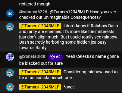 >>42890576The characters with current ongoing story lines are>The Twixie family - Fractured & Dracony Twilight>Rarity, Rainbow Dash, and Pinkie Pie - Dracony Pinkie Pie vengeance against Rarity>The Real Mane 6 - This might have been temporarily resolved>Shining Armor's small storyline which is tied with Coco's storyline, and Aspis's storyline>ApplePackage with Parcelcore who WILL return.>Big Mac, Future Soarin, Clean Sweep storyline >>42890336Well too bad. ApplePackage is the most popular stallion ship in Tamers, more popular than Soarburn. They won't be sidelined for long.