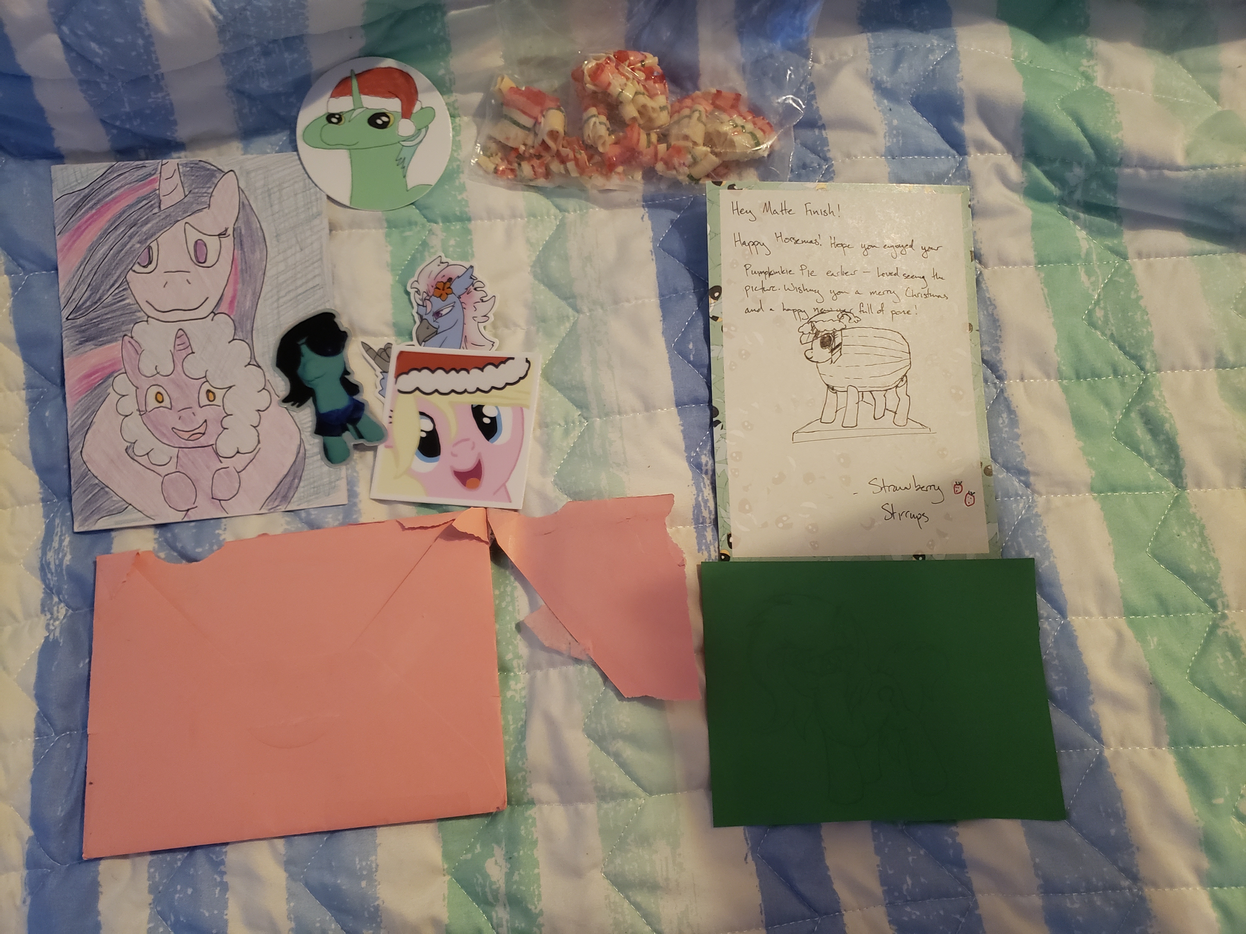 Salty Licorice, Badland Bells, and Strawberry Stirrups I opened your cards today!Salty, I wasn't the only one excited to receive your card because the postal service opened the letter for me! It arrived with the envelope as seen in the photo so hopefully nothing was lost. I love the drawing you did with my filly and Princess Twilight 2.0. I also love the stickers you sent with the card.Badland Bells, I love the anonfilly drawing on the card. It doesn't show up great in the photo but it's very cute and I love it. Strawberry Stirrups, your candy is delicious! I love the drawing of Twilight Spumpkle. Pumpkie Pie would love it too but I had to retire her because the pumpkin was rotting. I love the numget design on the card as well; comic sans is an excellent font choice.