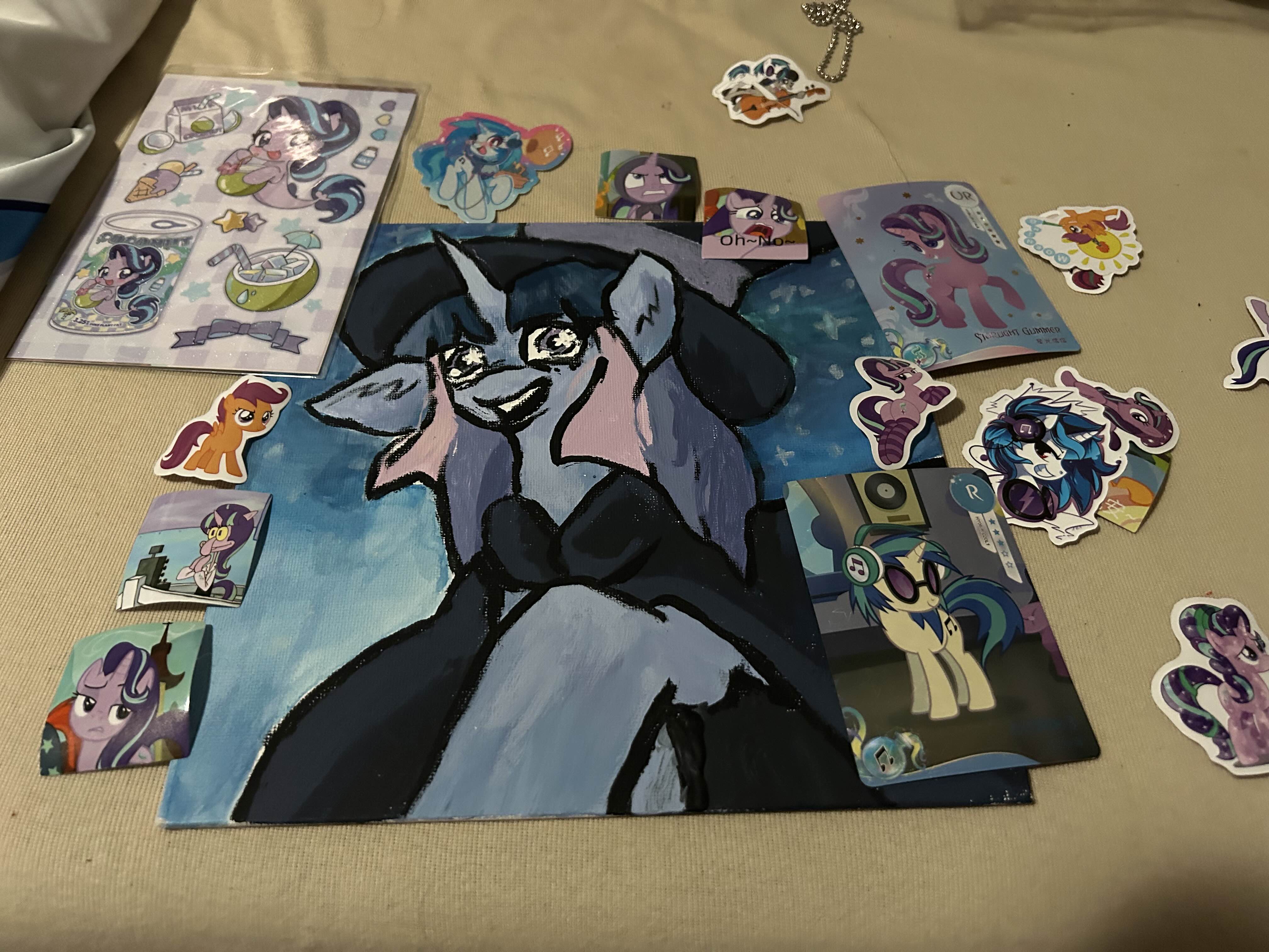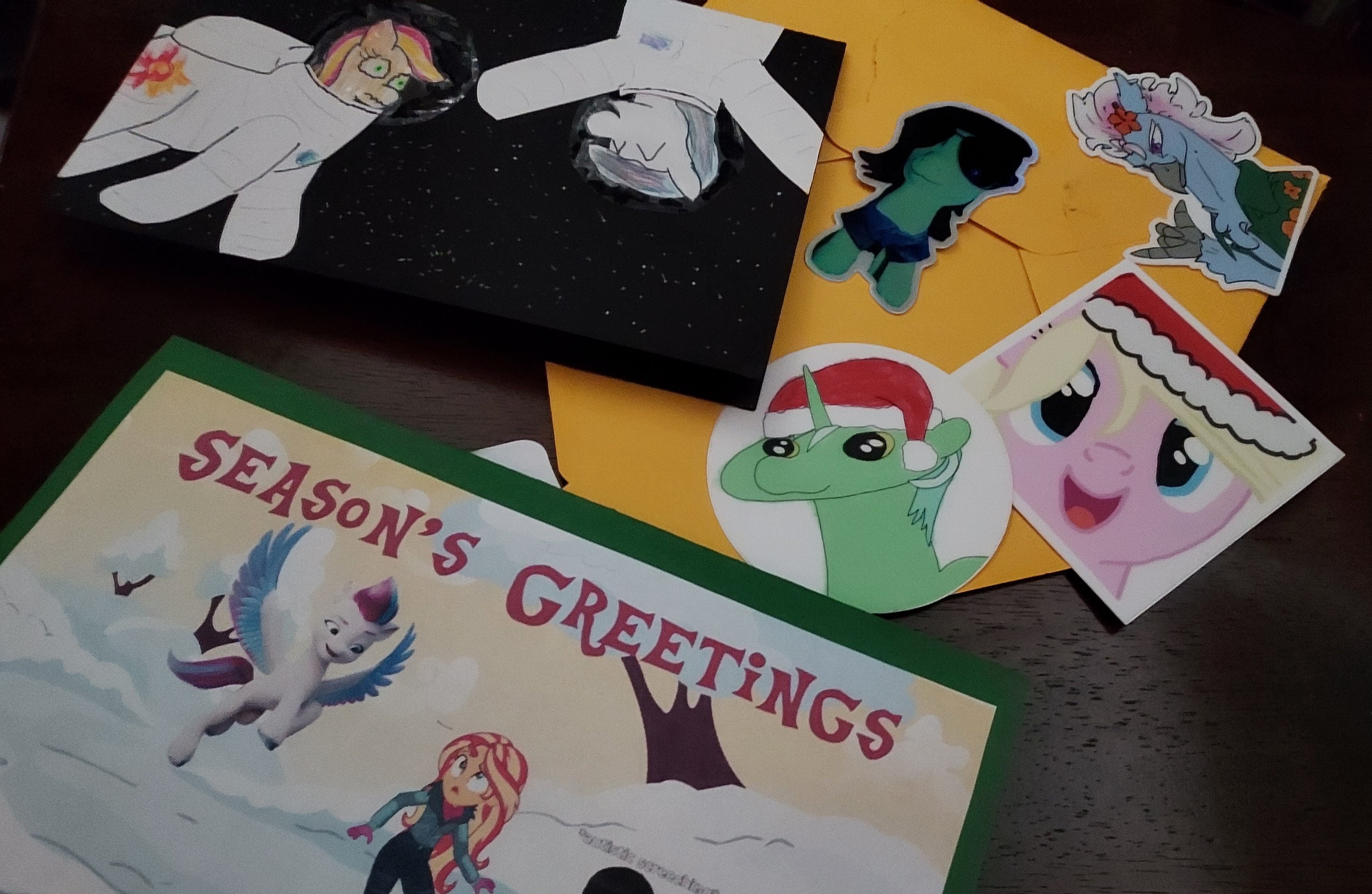 Alright, how about some cards in the meantime? I haven't gotten around to posting these 3 but all of them made me smile.>Twin TalesFirst of all thank you for the ADORABLE card and all the goodies. Your drawing of Pinkie Pie on the back is full of sovl and I will cherish it in my shrine forever. The magnet will go straight to my fridge and the ornament will go straight to my tree! Hope you have a fantastic horsemas! >Posterboard Love the Marezona print and the stickers! The (You) will make a great addition to my computer desk. This art for the card is pure kino, and yes I noticed the little UFO in the corner. Is it the green alien monkey man? Who knows! But I always enjoy it when people incorporate the place of origin into the cards they send. Hope you have a great horsemas even if Marezona doesnt get any snow! >Shoofly Slush the ChangelingFirst of all, I want you to know the spaghetti envelope cracked me up before it even arrived. I am signed up for USPS informed delivery so I had a photo of it sent to my email at 7am while I was groggy at work earlier this week. I giggled and it made my day better. Definitely keeping the envelope for this one in my SS card stash (I always keep the cards themselves but I don't feel the need to keep the envelopes if they are plain) And the card itself is so good, love the stocking luna art! And the Pinkie Pie guillotine sticker is hilarious, very happy I could be the ponkfag you were looking for to give it out to. I am honored. Hope your horsemas is awesome