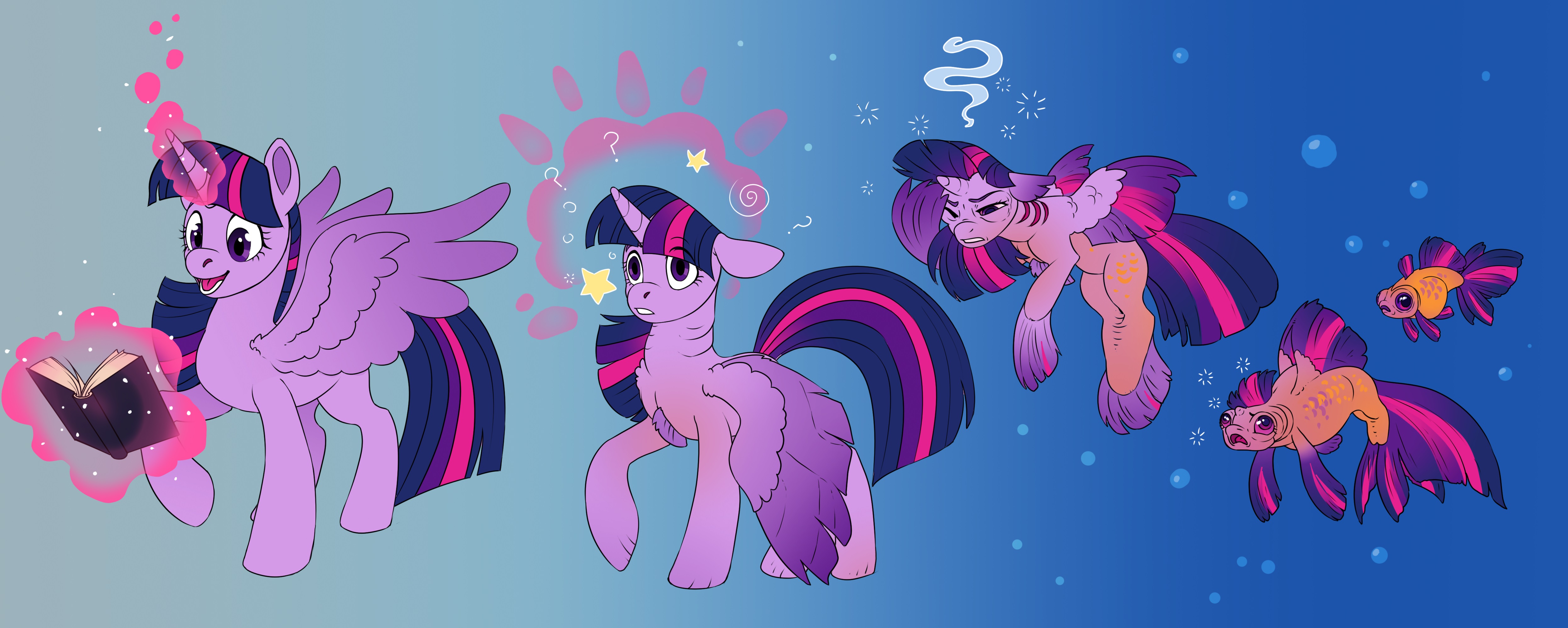 …What had she been trying to do again?Twilight shook her head, trying to jostle loose the faint fuzzy feeling that had started. … when had it started? She couldn’t remember how long it had been since… What had she been doing? …Oh, right. She had been casting a spell. … What had the spell been about? She was having trouble recalling…Twilight shook her head again. Or, she got the feeling it was “again.” Hadn’t she just done that? The motion made her dizzy, and she stumbled in the fetlock high water. …water? Since when had she been standing in water? … Where.. was she? How… had she… gotten here?What had she just been doing again?Her eyes felt puffy, and her horn was tingling. She thought there must be a reason. Something that she had just done.. but… She couldn’t… remember.Twilight’s legs felt weak. Wobbly. She was sloshing around the belly deep water as she swayed from side to side. Her head felt thick and fuzzy. Her horn tingled, spreading a numb, creeping feeling throughout her skull. She tried to raise a hoof to her head to rub at her aching horn, but she could barely feel it.Her horn felt… small. Smaller than it should be. At least, she thought it should be bigger than that. Her puffy eyes wouldn’t focus right, but her hoof looked odd. It seemed… flatter. wobblier. the color was off. Twilight squinted at it for a moment as water lapped up her neck and into her gills.… What had she just been doing again?… Something was wrong. Twilight was sure of it. There was something that had happened, or maybe was happening? Would happen? She… She wasn’t sure…Something was wrong…What had she just been doing again?Twilight looked down at her limbs. Something seemed wrong with her tail. Her… legs? Her… tail? Were her legs merging into her tail?… She had… legs.. right? … She couldn’t remember……What had she just been doing again?Twilight felt her face distort and stretch. her wings… her fins… her wings were merging into one dorsal fin… something was wrong… was something wrong?Something was wrong. Twilight was sure something was wrong. She couldn’t remember… she couldn’t remember…That was it. Wasn’t it? She couldn’t remember. remember… remember what? What had fish… what had Twifish… what had Twilight forgotten?Twish’s eyes bulged as she strained to remember… to remember…What had Fish-light been doing again?She… it… she… had to… remember something. Something… what had she been trying to remember?Tish had been trying to remember it’s name! It could remember that! It was… It was…Fish couldn’t remember.…What had fish been doing again?